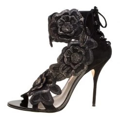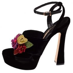 Sophia Webster Black Velvet Flower Embellished Platform Ankle Strap Sandals Size 40.5 For Women