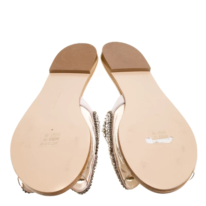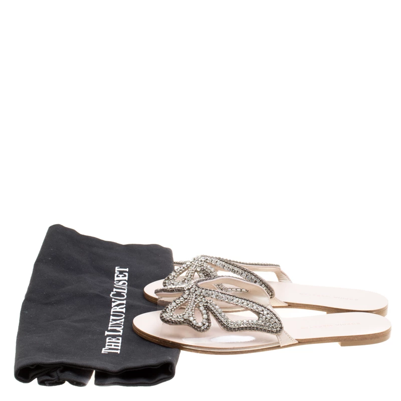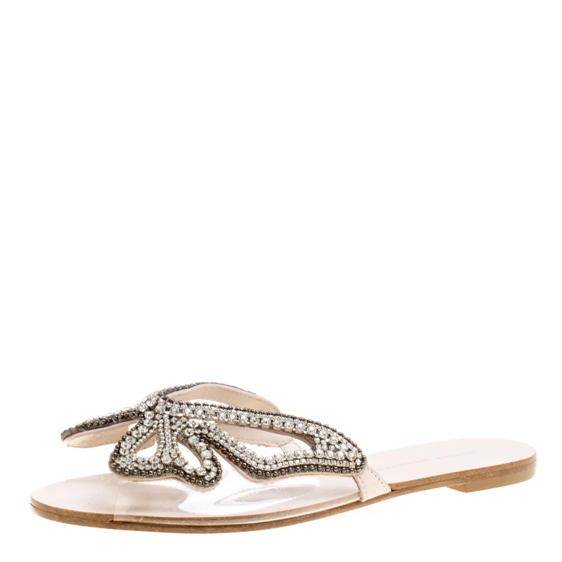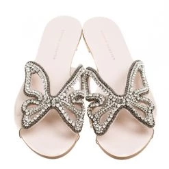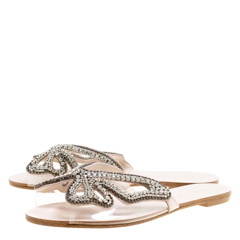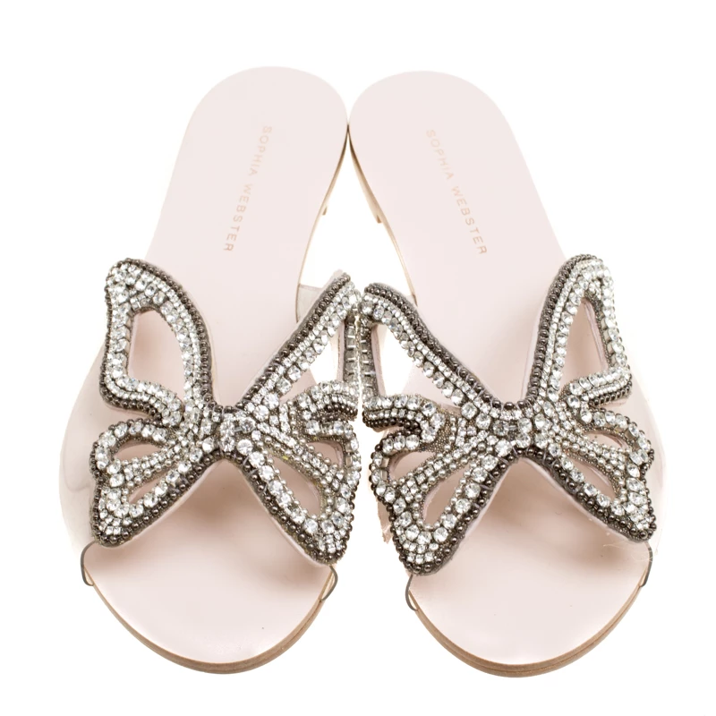 These beautiful flat sandals from Sophia Webster are here to adorn your feet with sheer elegance! The beige Madame sandals are crafted from suede and PVC and feature an open toe silhouette. They flaunt a butterfly motif detailed vamp strap that is embellished with exquisite crystals. They are complete with comfortable leather lined insoles.