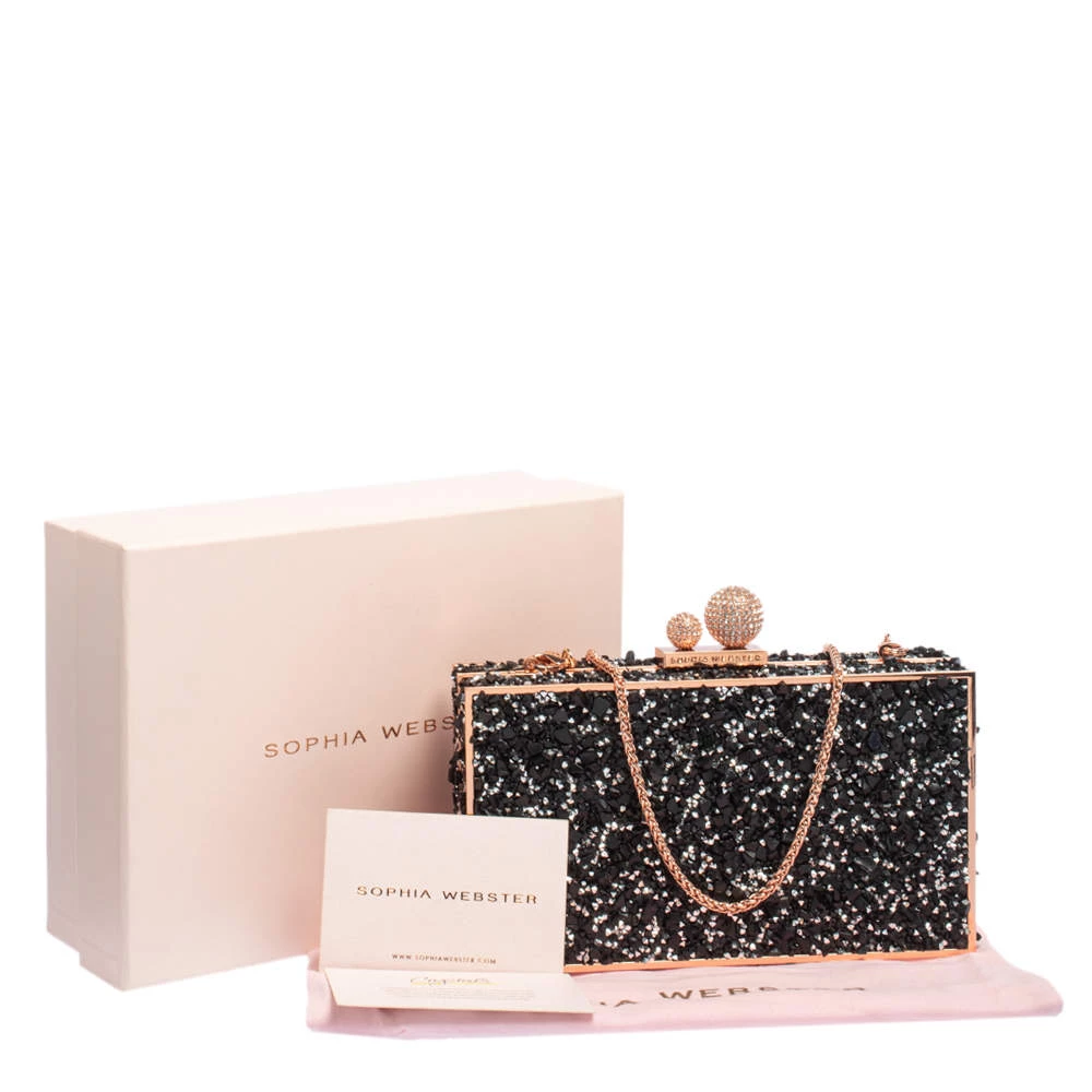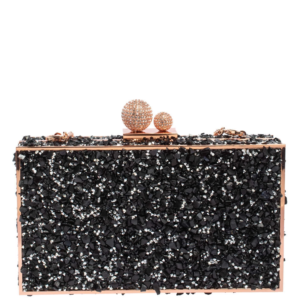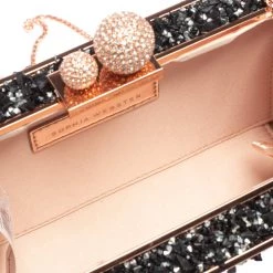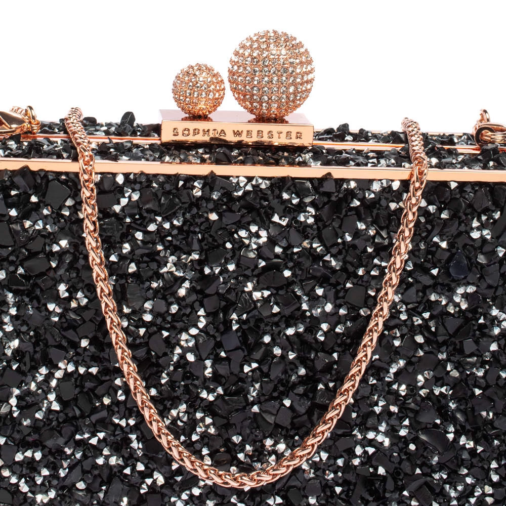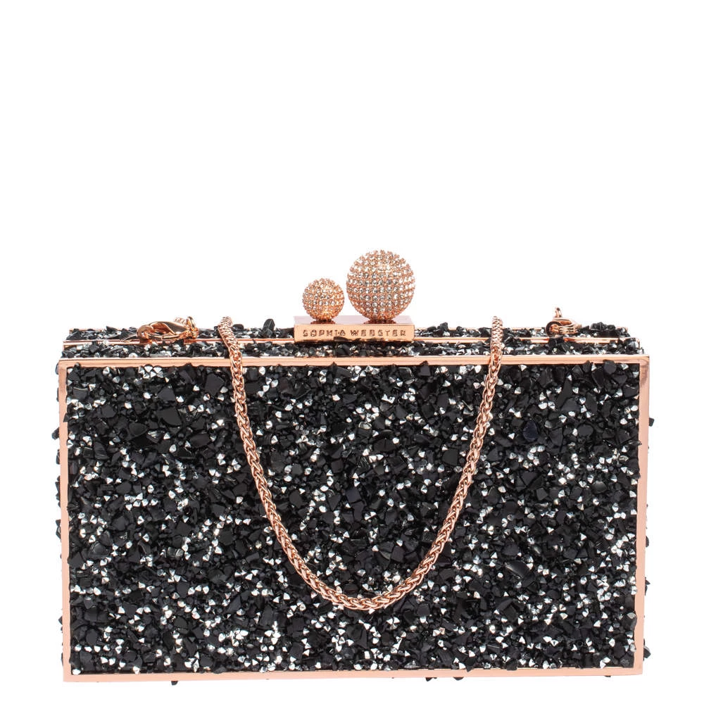 This beautiful Clara box clutch from Sophia Webster will charm you with its striking details. The black clutch is crafted using rose gold tone hardware and embellished with crystals all over. On the top are two crystal studded balls that act as the clasp and give way to the satin-lined interior. Carry it with a cocktail dress and pointed stilettoes to win praises!