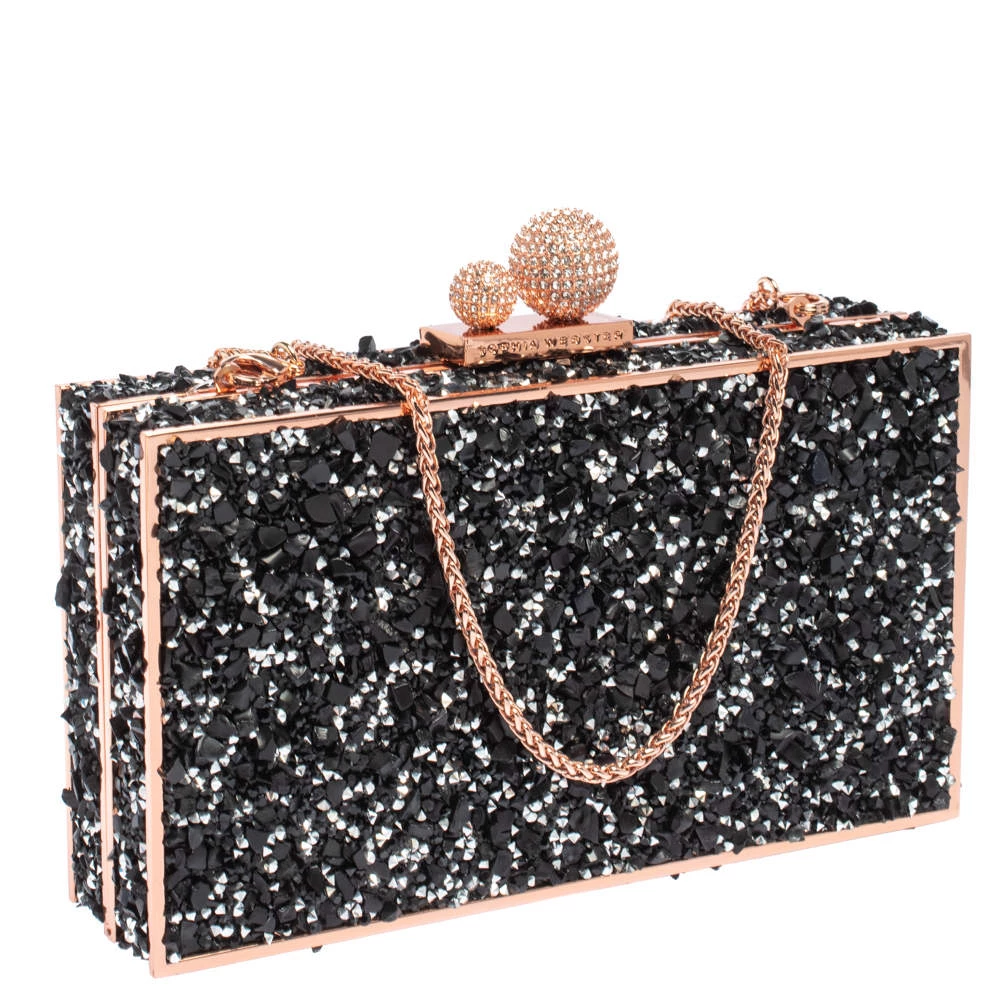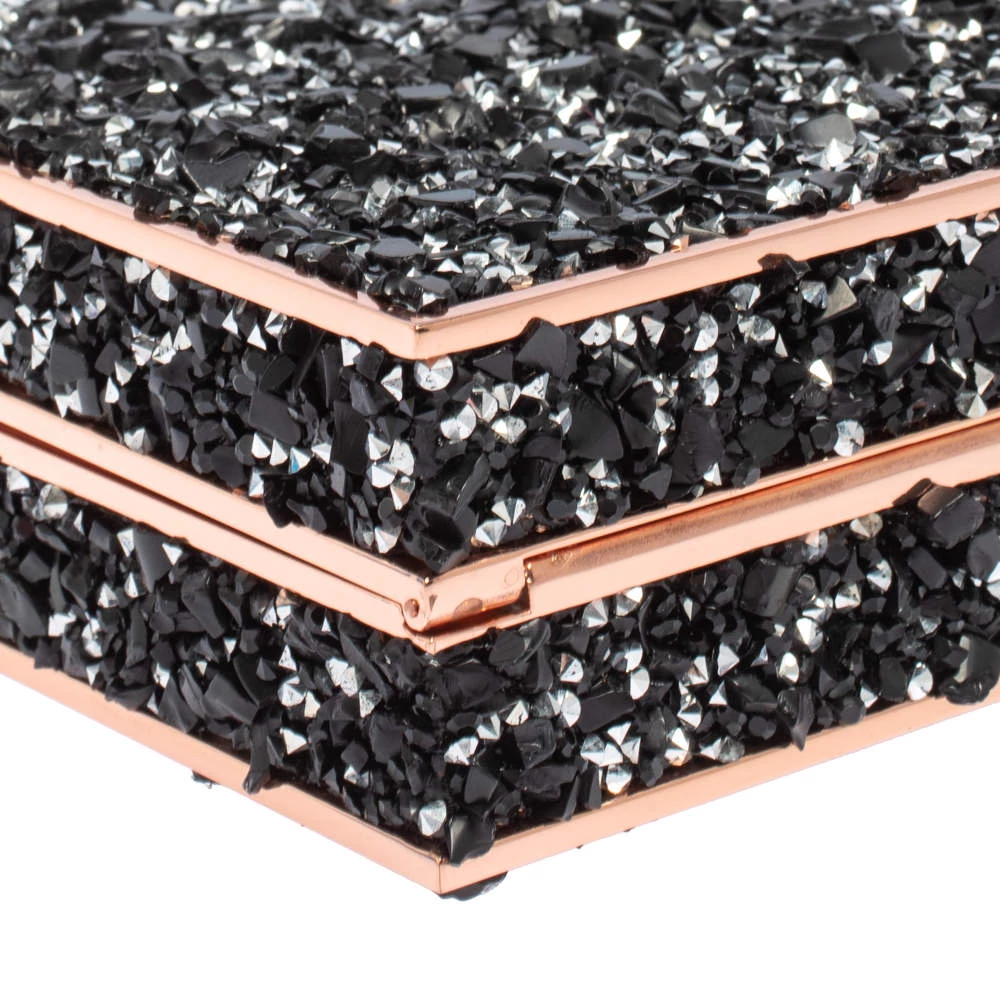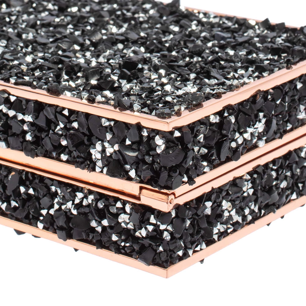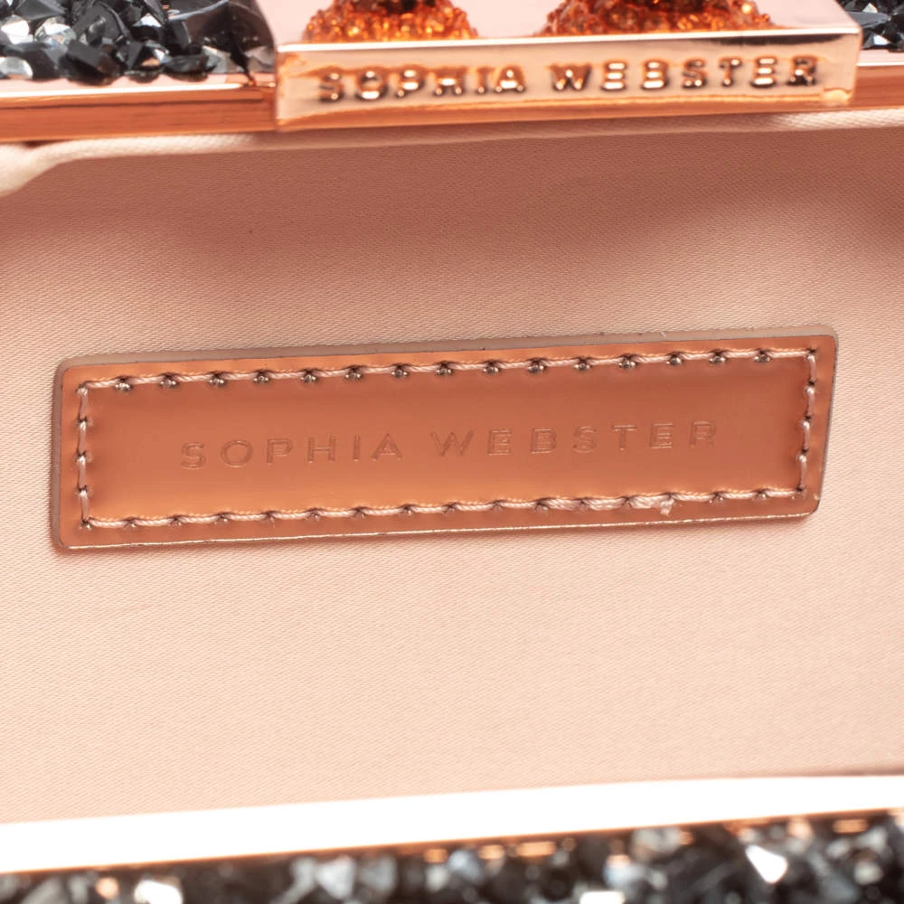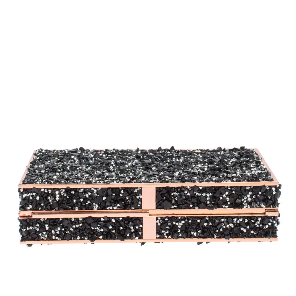 This beautiful Clara box clutch from Sophia Webster will charm you with its striking details. The black clutch is crafted using rose gold tone hardware and embellished with crystals all over. On the top are two crystal studded balls that act as the clasp and give way to the satin-lined interior. Carry it with a cocktail dress and pointed stilettoes to win praises!