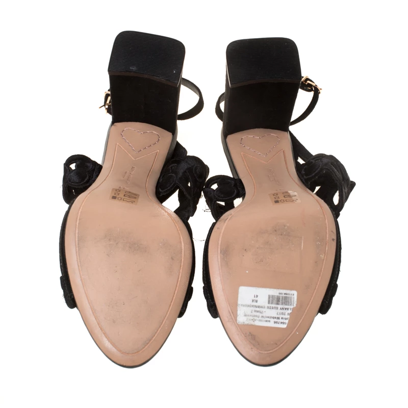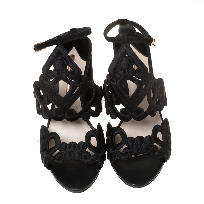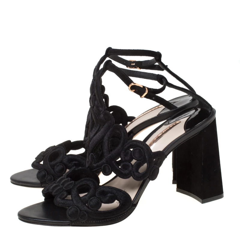 Beautifully designed in classic black suede, these Sophia Webster Albany sandals are perfect for both day parties and evening dance parties. With embroidered lace detailing on the front and the block heels, these shoes are complete with buckled strap closures at the ankle which creates a graceful and elegant feminine look.
