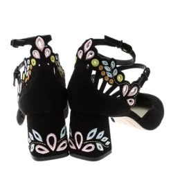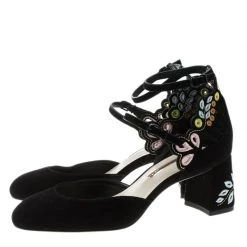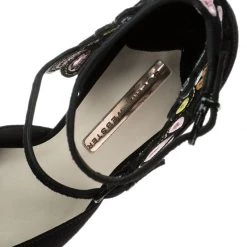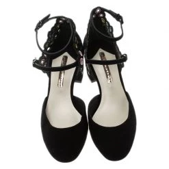 Beautifully designed in classic black suede, these Sophia Webster Liliana Mary Jane pumps are perfect for both day parties and evening dance parties. With multicoloured embroidered design all around the back and the block heels, these shoes two black metal buckled strap closures at the ankle which creates a graceful and elegant feminine look.