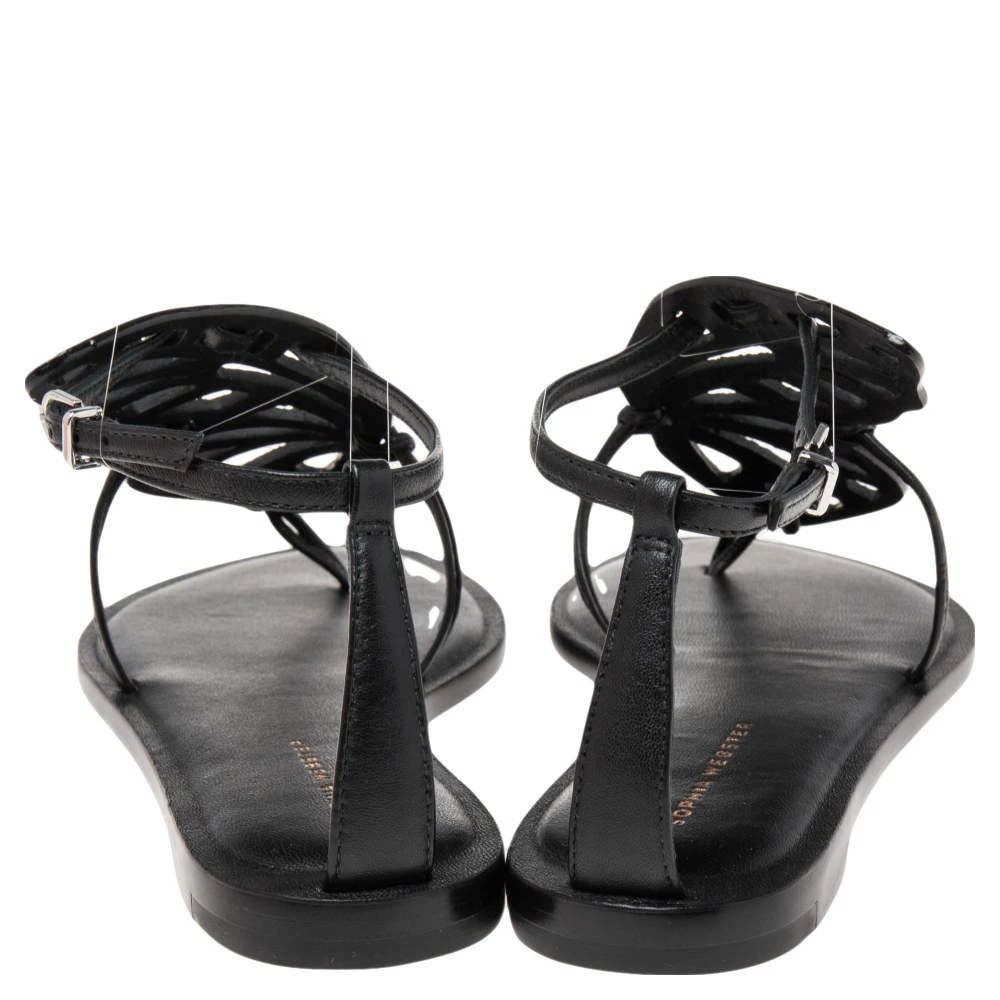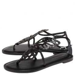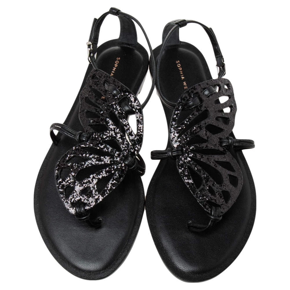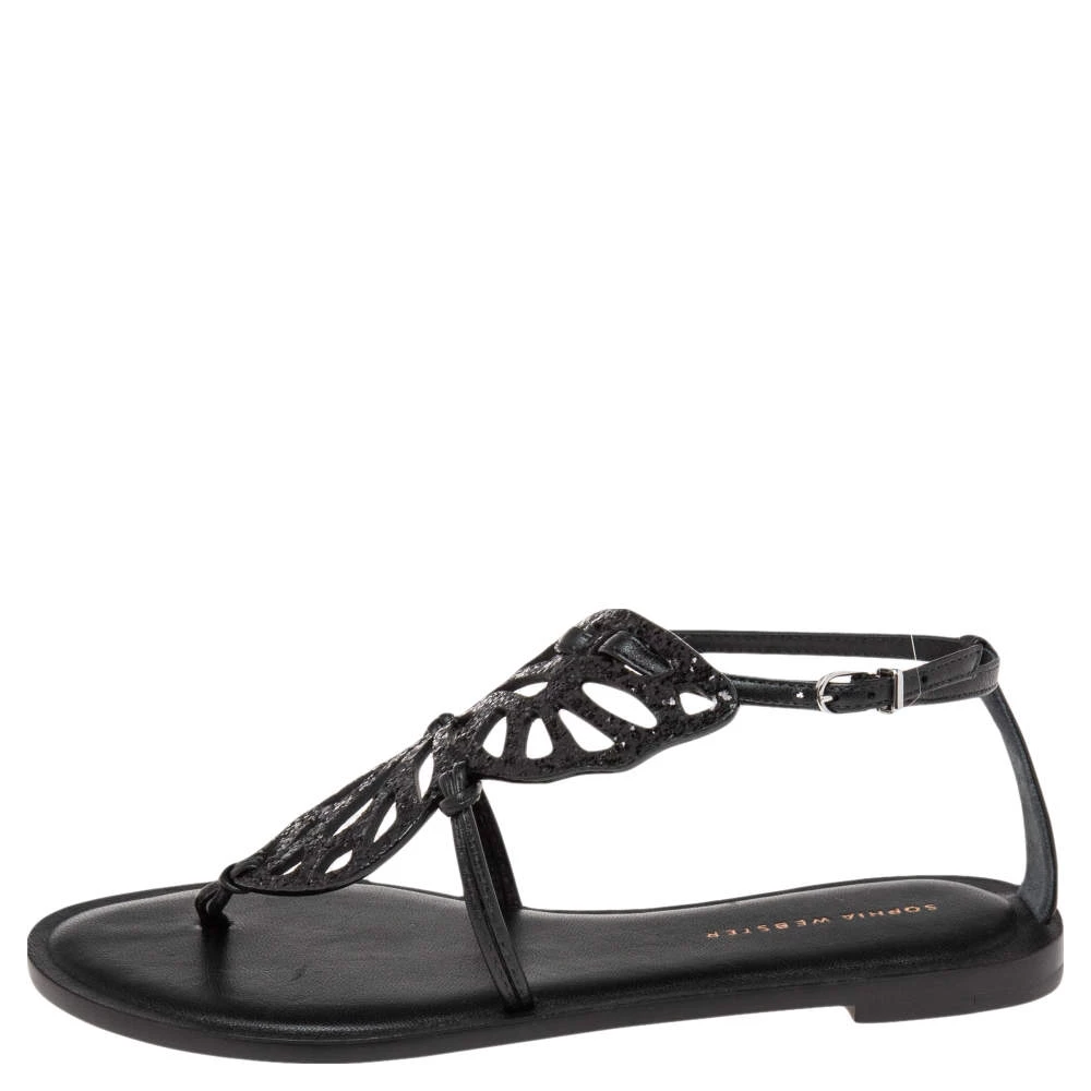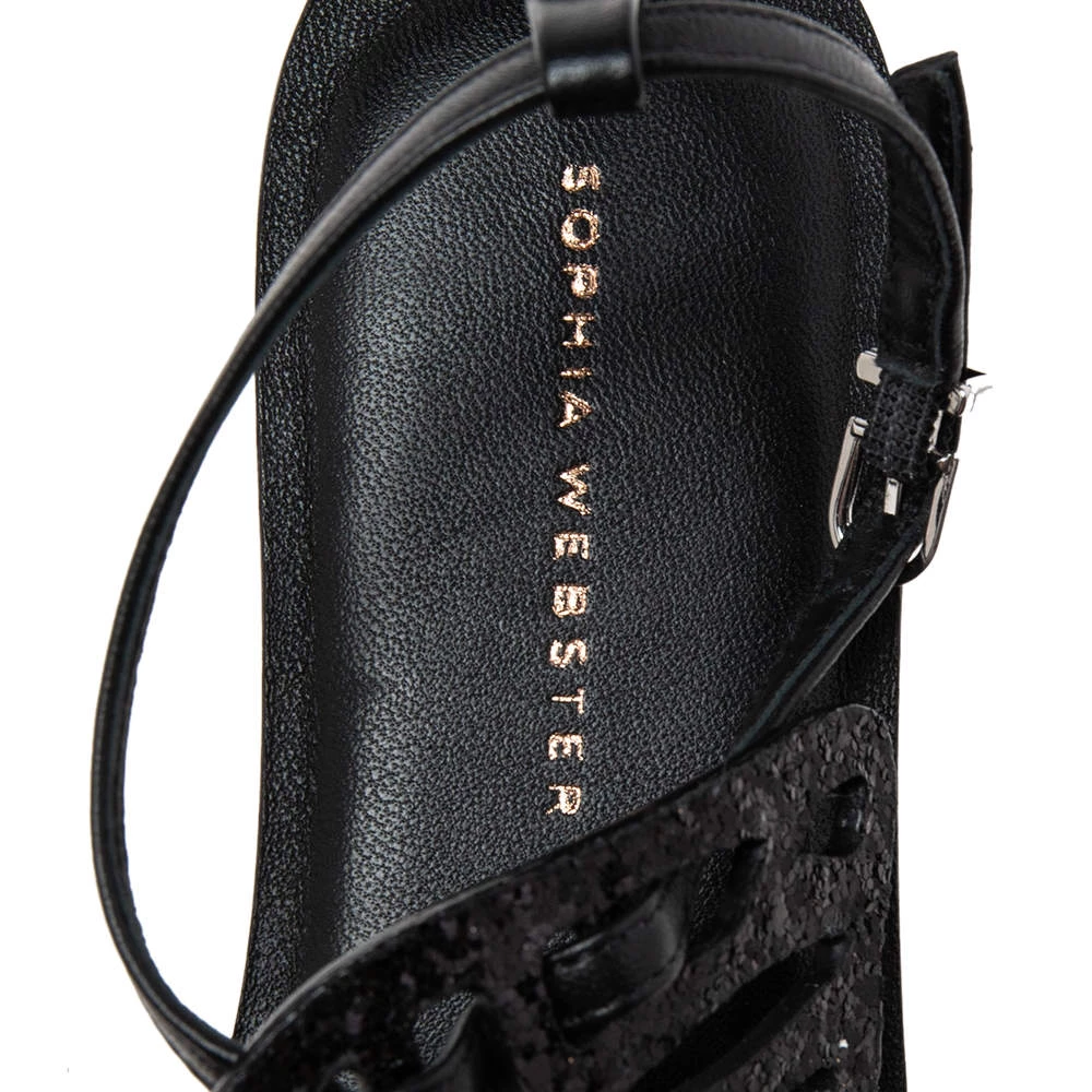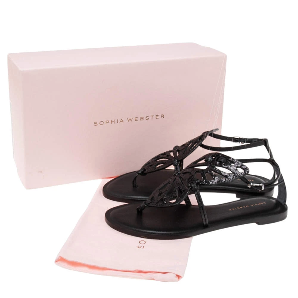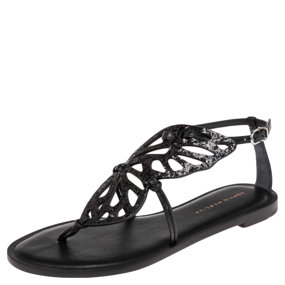 Take every step with elegance in these fabulous sandals from Sophia Webster. They are crafted using black glitter leather, with a Butterfly embellishment on the upper strap. They have silver-toned hardware and buckle closure. Match them with your outfit for a chic look.