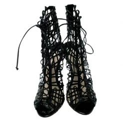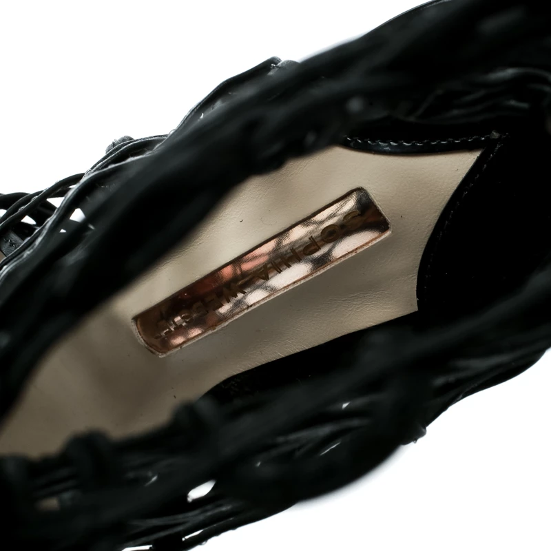 You will love walking in these Delphine sandals from Sophia Webster. These black sandals are crafted from leather and feature a peep-toe silhouette. They flaunt a cage design on the vamps and come equipped with tie-ups, comfortable insoles, and 10.5 cm stiletto heels.