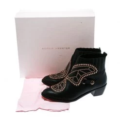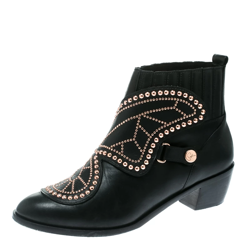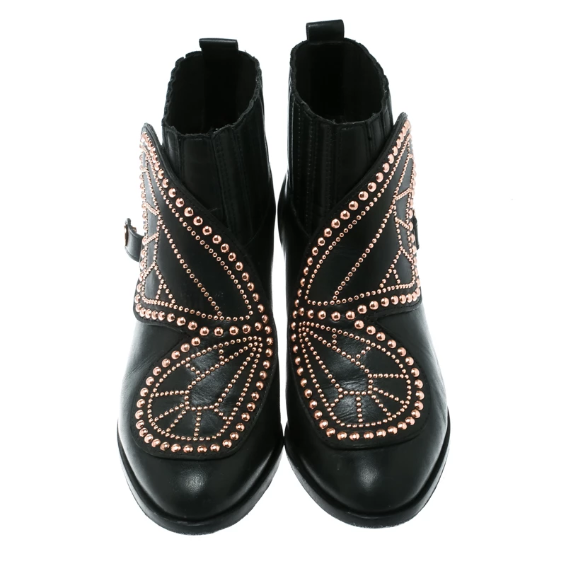 This unique pair of leather boots is all you need to bring out your creativity to your next outing. Crafted from leather, the boots feature stud detailing in the pattern of a butterfly and block heels for a slight lift.