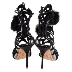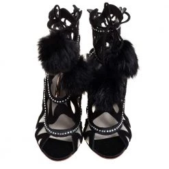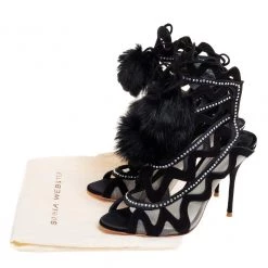 Sophia Webster presents to you these black sandals that will envelop your feet in style. They have been crafted from suede and mesh into an open-toe cage-like silhouette with fur tie-up fastenings at the back. They are equipped with comfortable insoles and elevated on 10 cm stiletto heels.