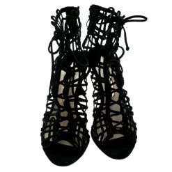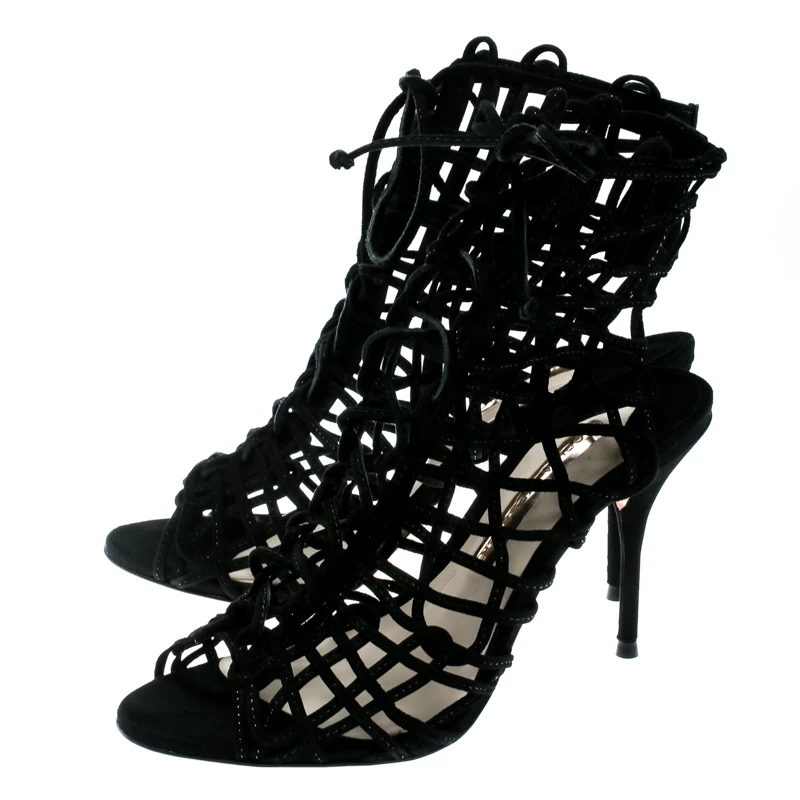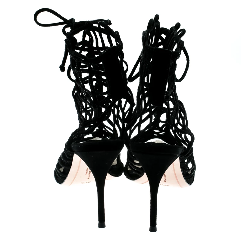 You’ll love walking in these Delphine sandals from Sophia Webster that are perfect for your fashionable outings. These black sandals are crafted from suede and feature a peep-toe silhouette. They flaunt a cage design on the vamps and come equipped with tie-ups, comfortable insoles and 9.5 cm stiletto heels. Pair them with a knee-length dress and a sling bag to make heads turn.
