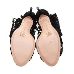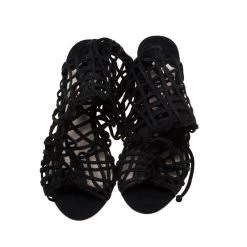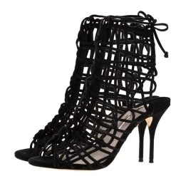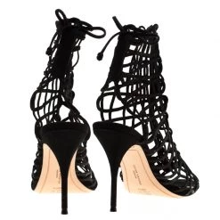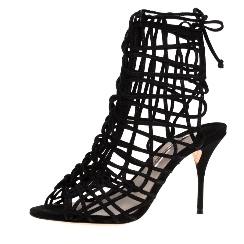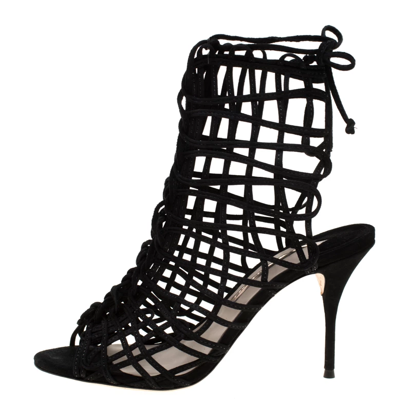 You’ll love walking in these Delphine sandals from Sophia Webster that are perfect for your fashionable outings. These black sandals are crafted from suede and feature a peep-toe silhouette. They flaunt a cage design on the vamps and come equipped with tie-ups, comfortable insoles and 10 cm stiletto heels. Pair them with a knee-length dress and a sling bag to make heads turn.