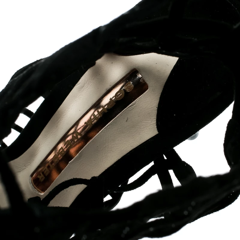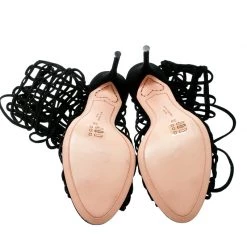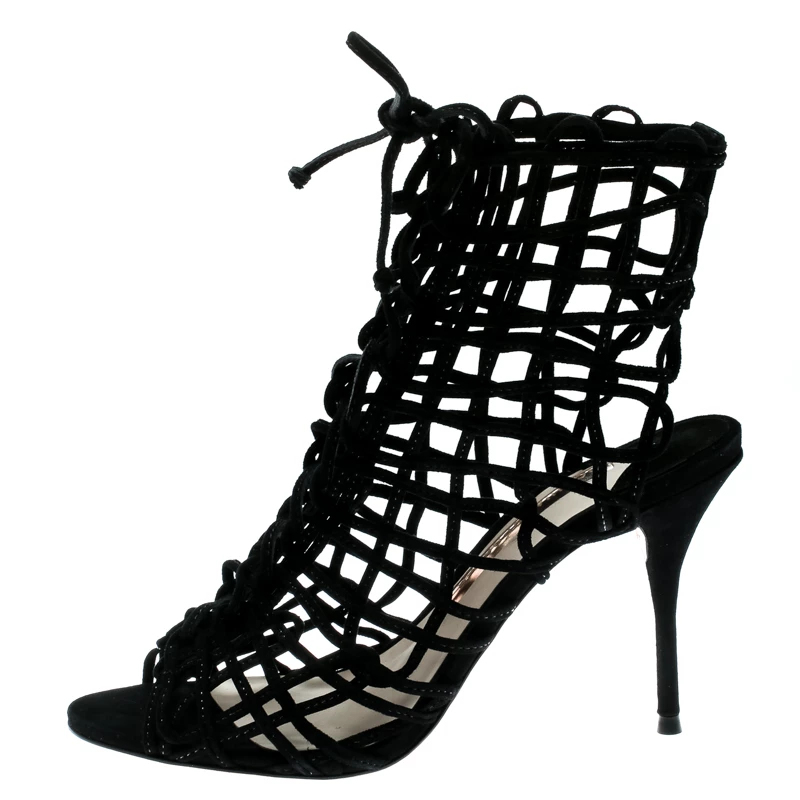 You’ll love walking in these Delphine sandals from Sophia Webster that are perfect for your fashionable outings. These black sandals are crafted from suede and feature a peep-toe silhouette. They flaunt a cage design on the vamps and come equipped with tie-ups, comfortable insoles and 10 cm stiletto heels. Pair them with a knee-length dress and a sling bag to make heads turn.