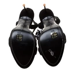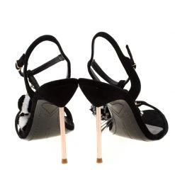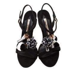Flaunt style at its best with these beautiful Layla suede sandals. Accentuated with gold-tone hardware, these T-strap sandals are embellished with pom pom detail. This black creation features 11.5 cm pencil heel. Team your favourite outfit with this Sophia Webster pair for an outstanding look.