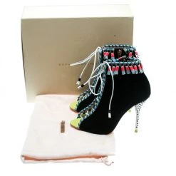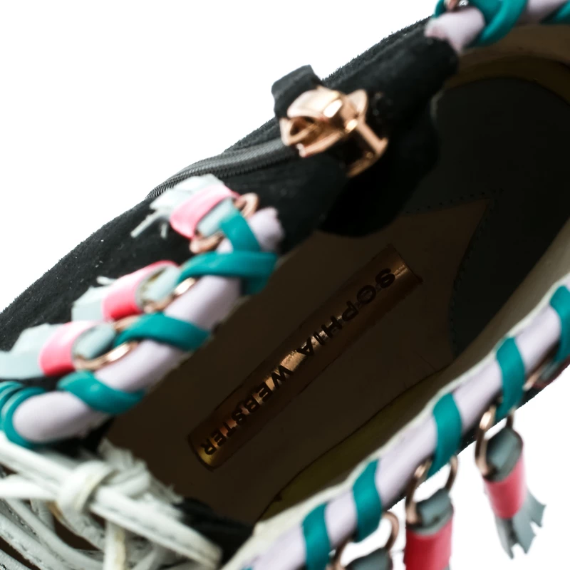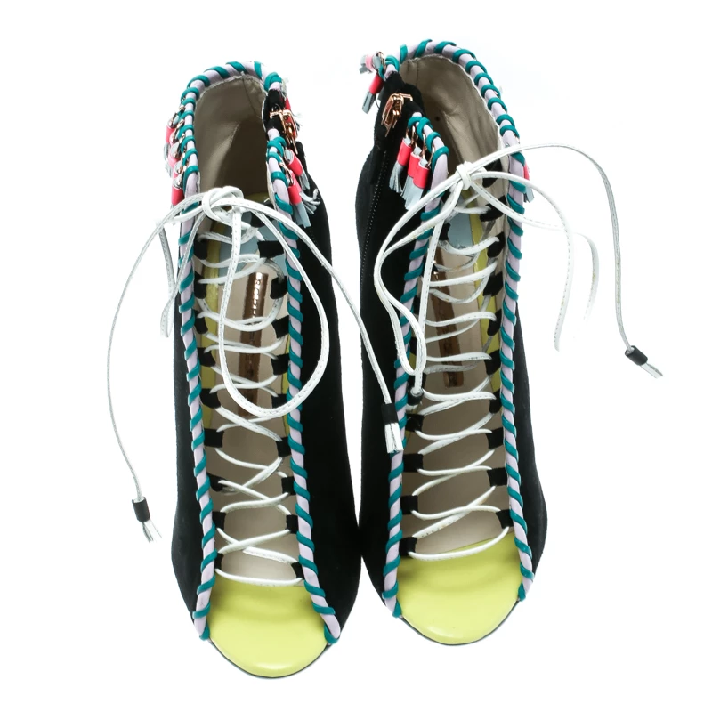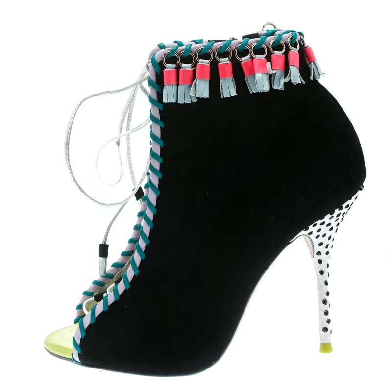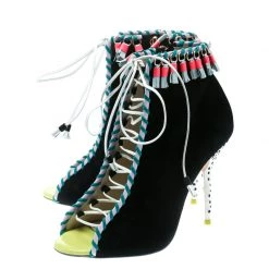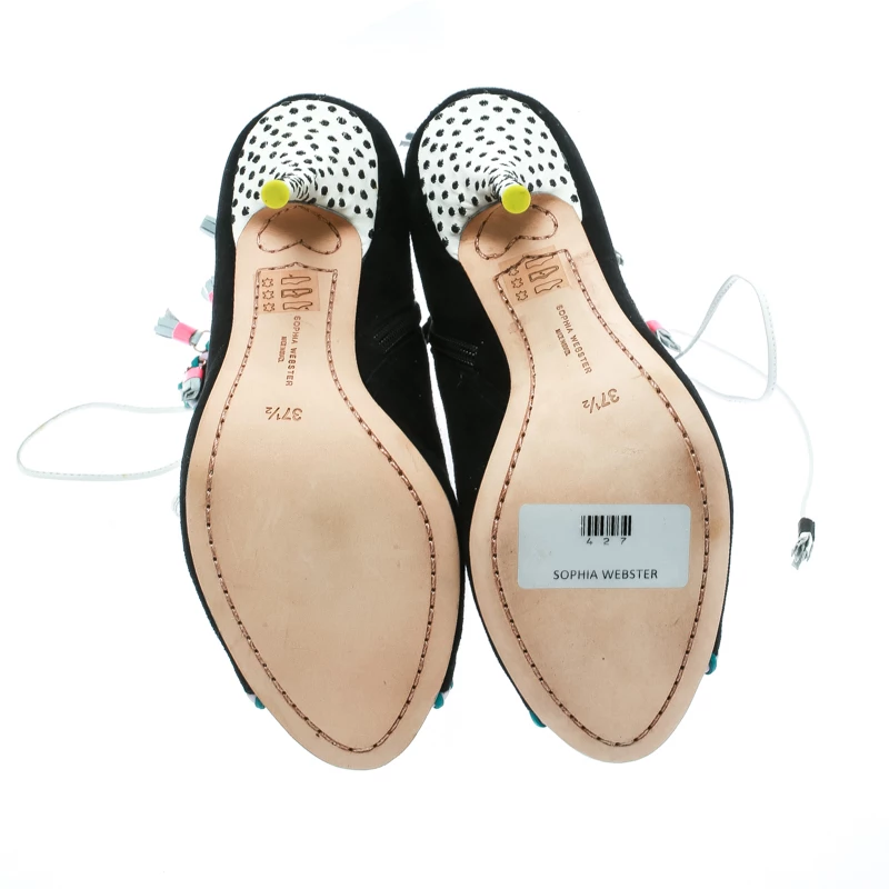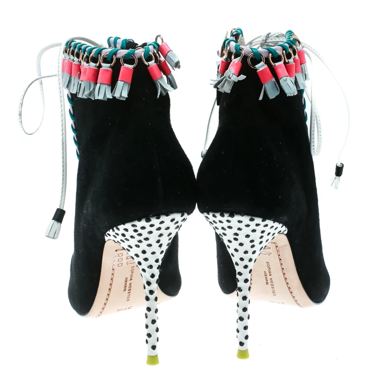 Contemporary and edgy, these ankle booties from Sophia Webster deserve a special place in your wardrobe! The black booties have been crafted from suede and feature an open toe silhouette. They have been styled with lace-ups on the vamps and embellished with tassels. Comfortable leather lined insoles and 10.5 cm stiletto heels complete this gorgeous pair.
