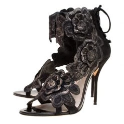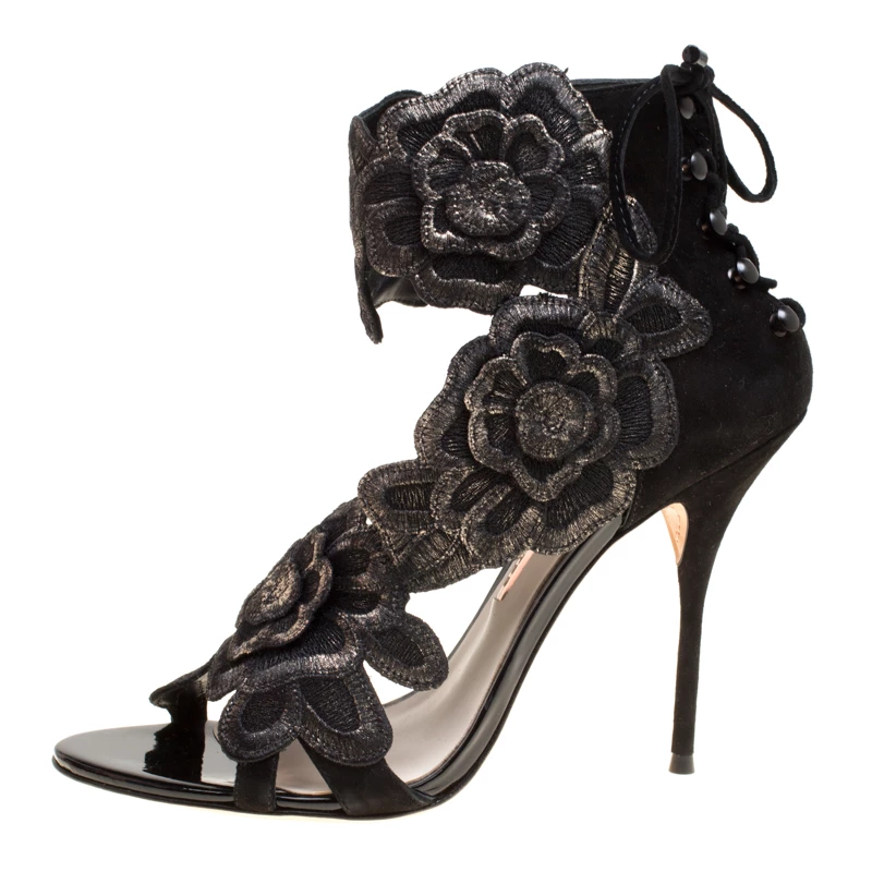 Blossoming with beautiful flowers, these Sophia Webster Winona sandals are that stylish pair without which your closet is incomplete. They are rendered in black suede and feature floral embroidered straps and ankle cuffs. The counters are detailed with tie-ups, and the pair is elevated with 11.5 cm heels. Don this gorgeous pair with your dresses and chic separates.