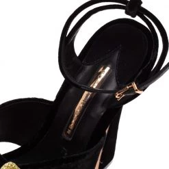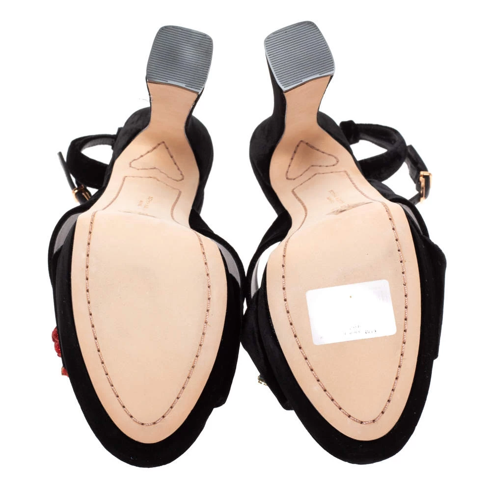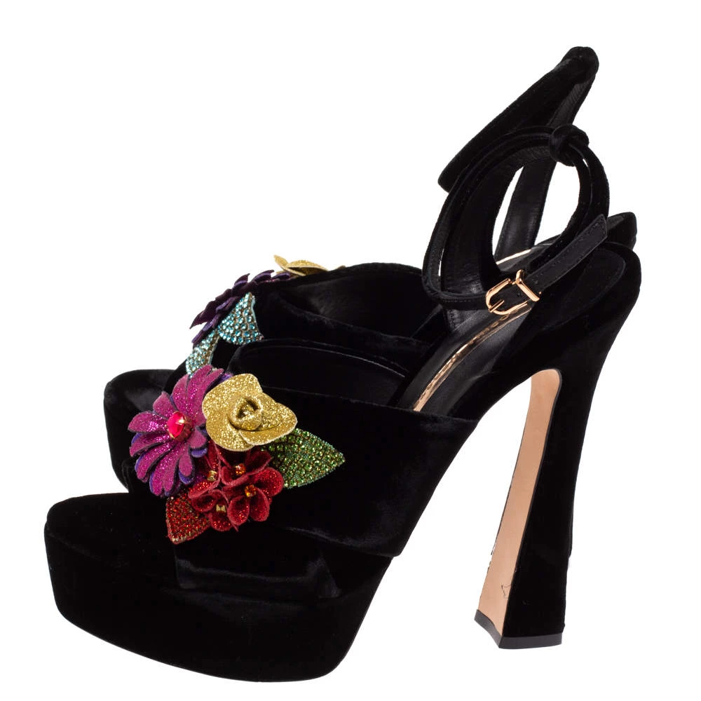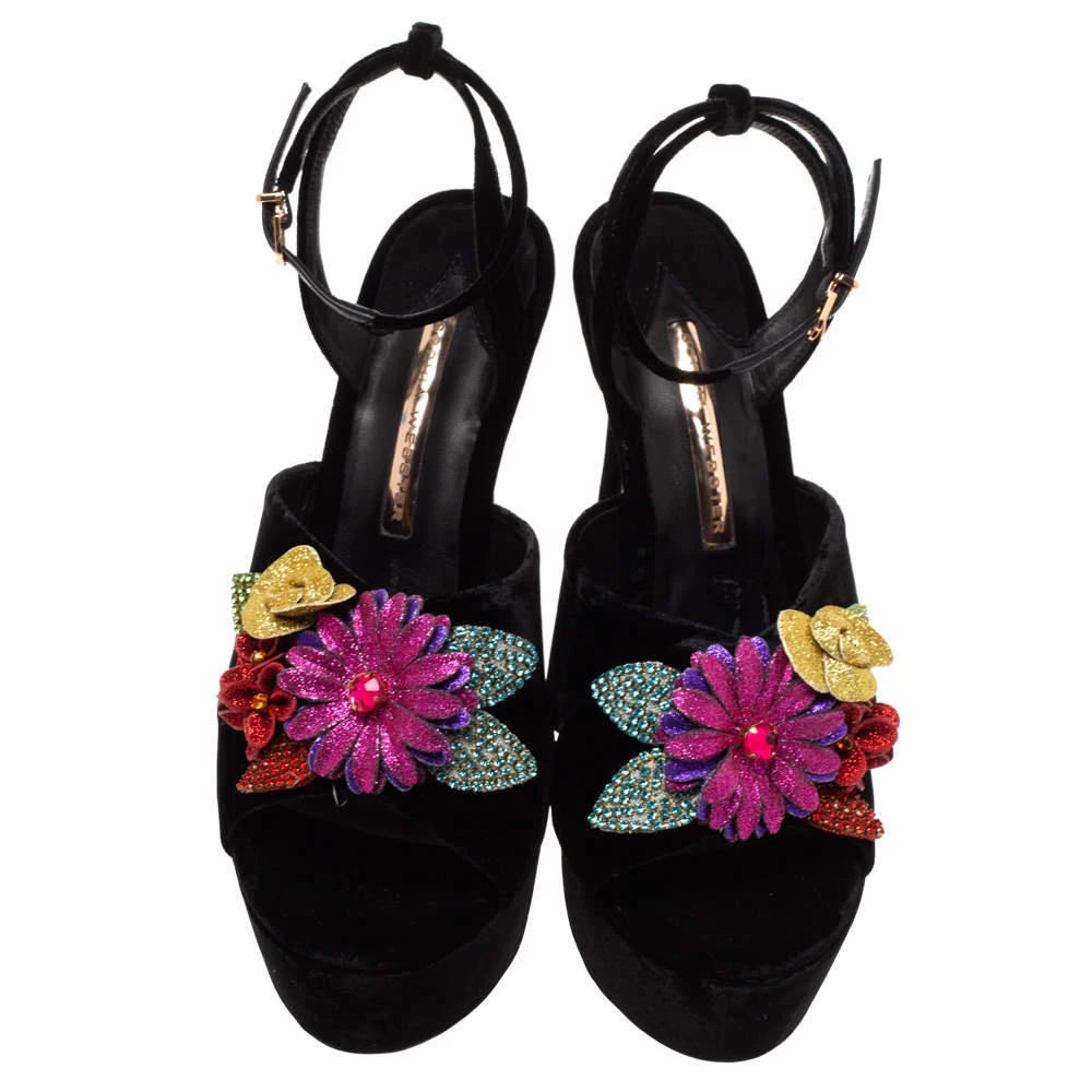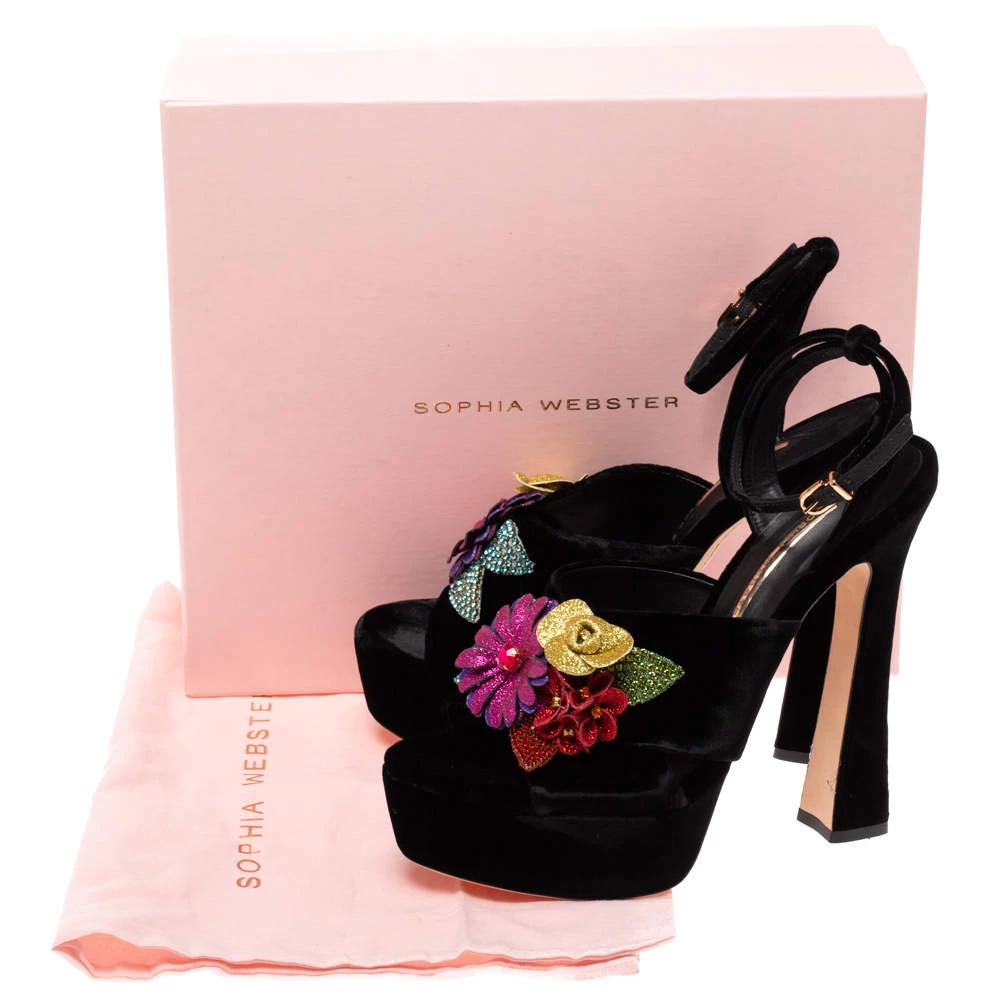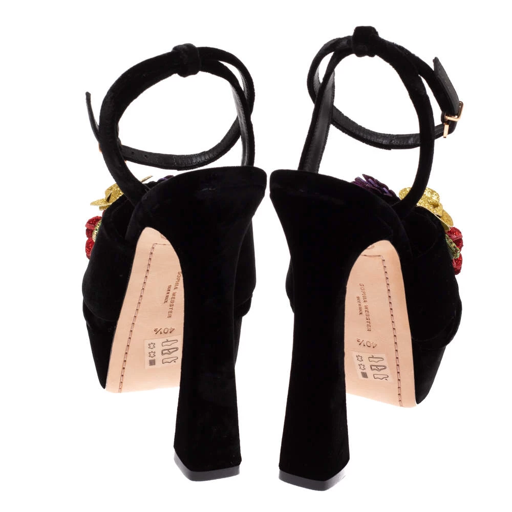 Exuding elegance and grace like no other, these sandals from Sophia Webster are absolutely ethereal! The black velvet construction brings to life gorgeous flowers that are embellished on the vamp straps. Equipped with buckle ankle straps, these beauties have comfortable insoles and stand tall on solid platforms and 15 cm heels.