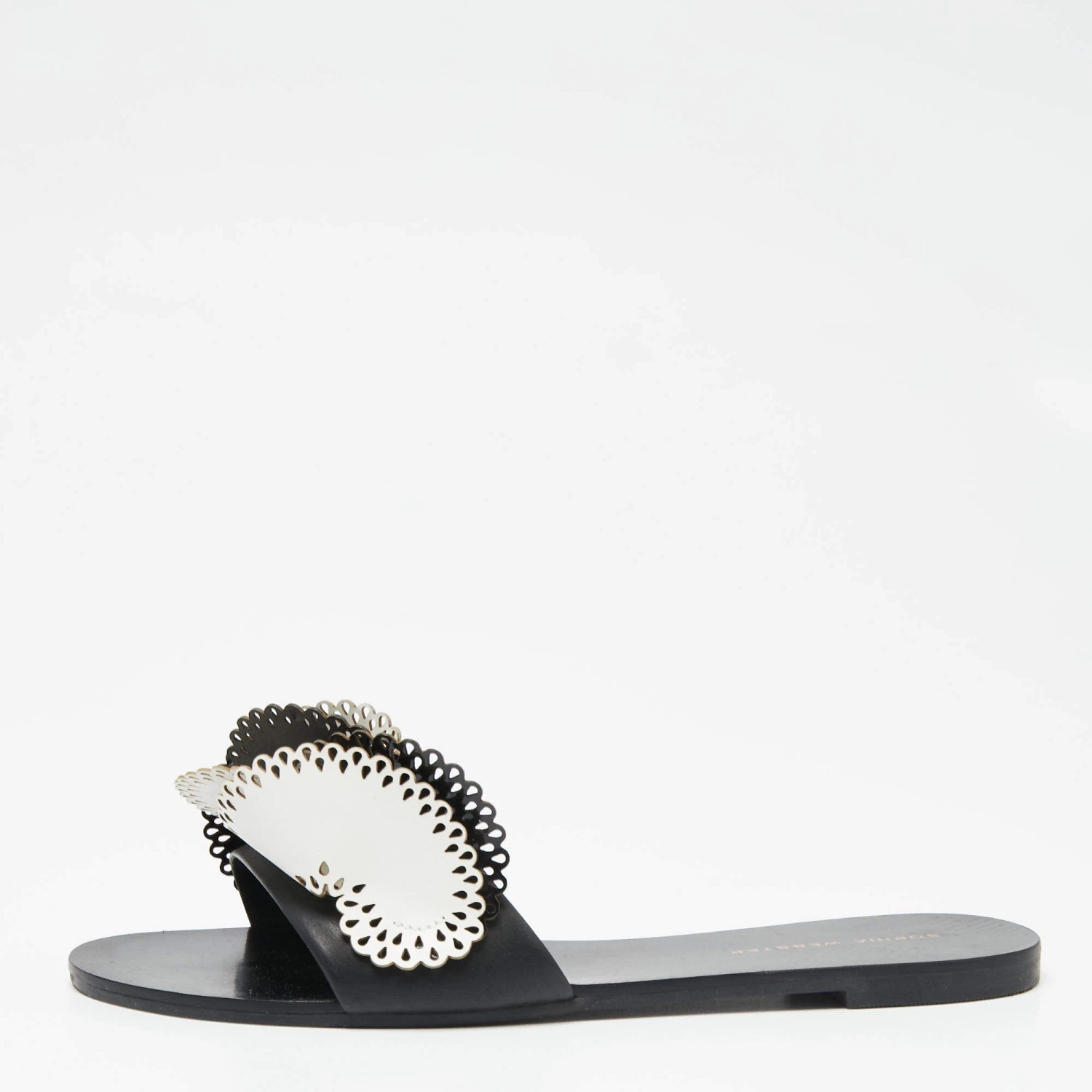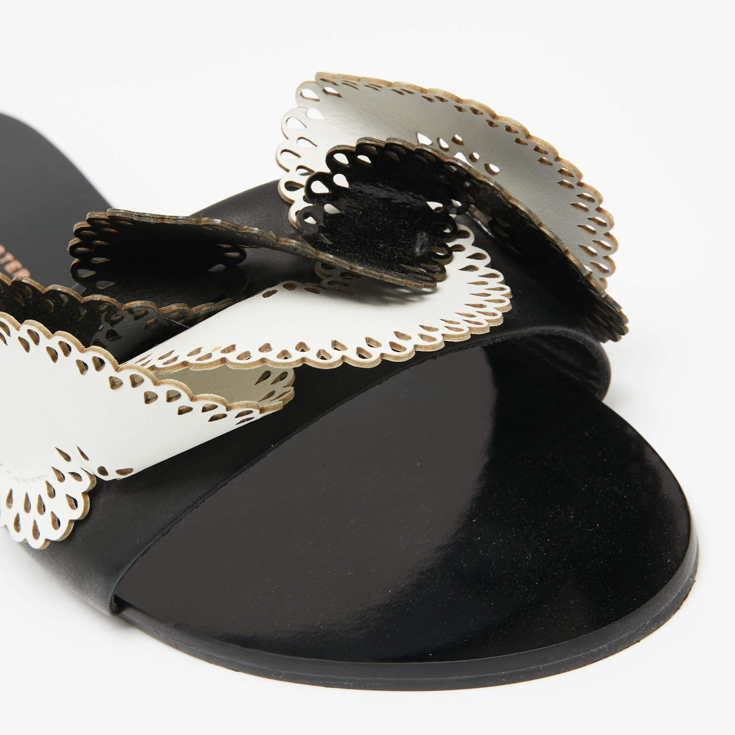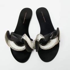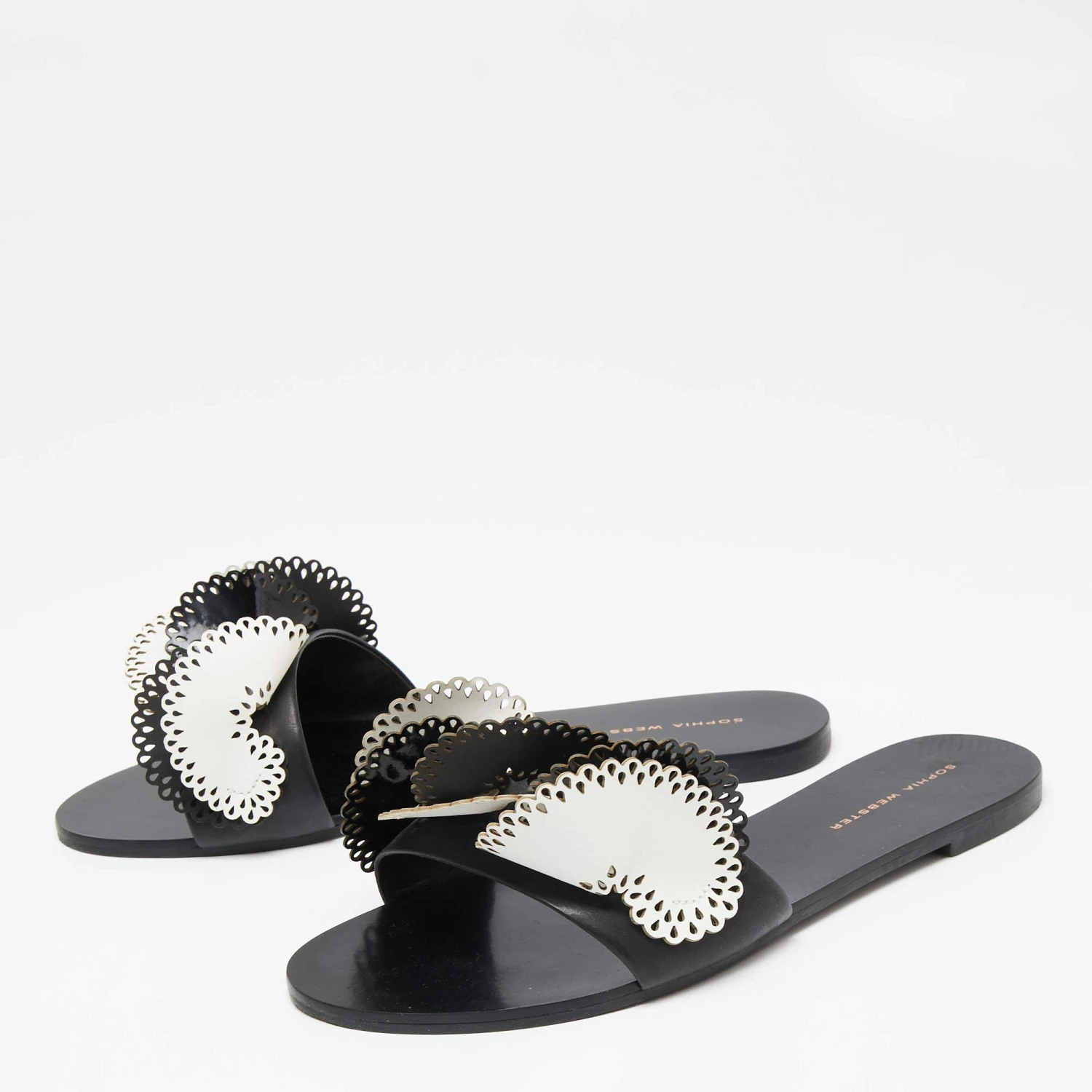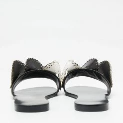 This fabulous pair of slides will brighten up your outfit in no time. These Sophia Webster slides are patent and leather-made and they carry black and white shades. But what makes this pair so desirable are the beautiful laser-cut-detailed appliques on the uppers. This is definitely one pair that speaks beauty in a simple way.