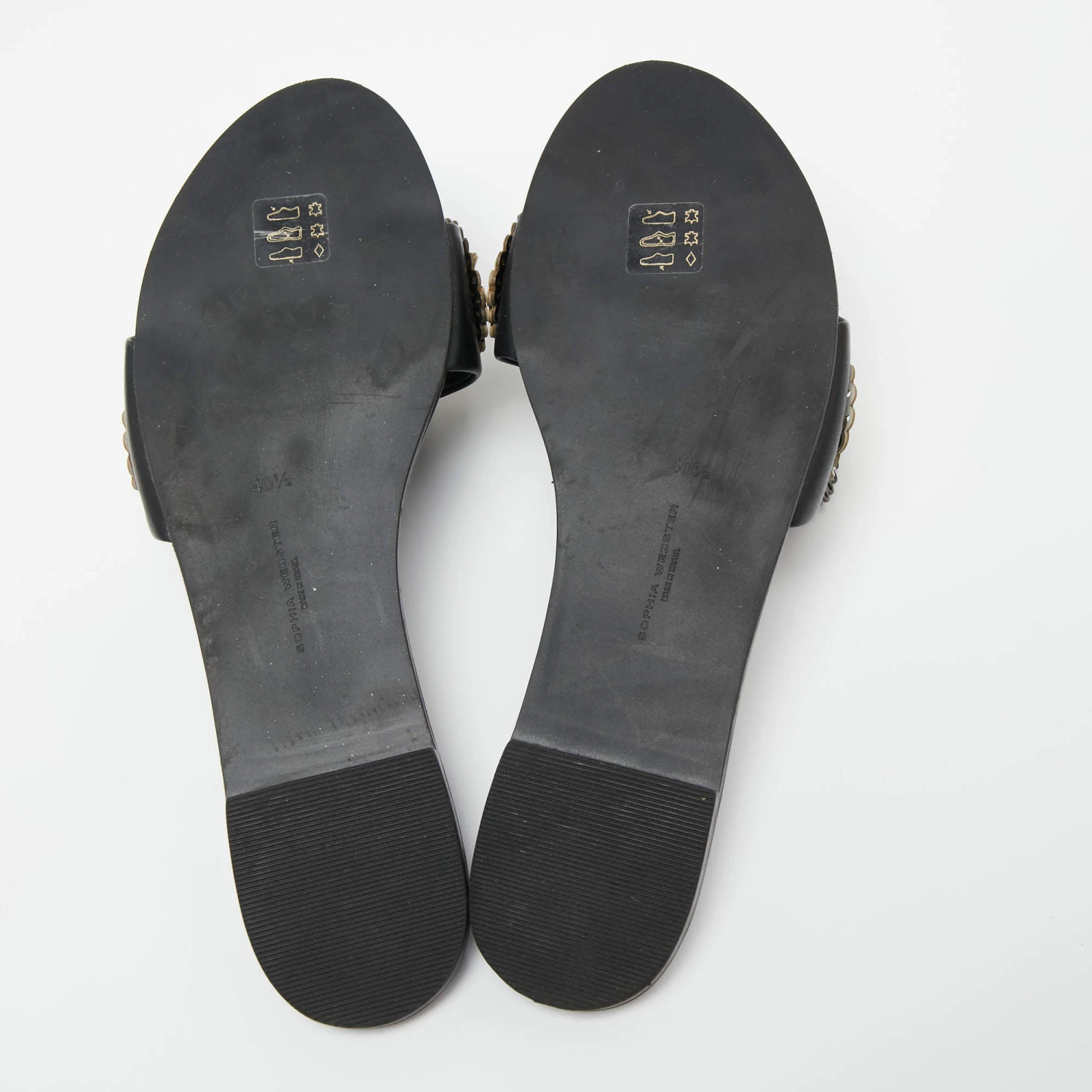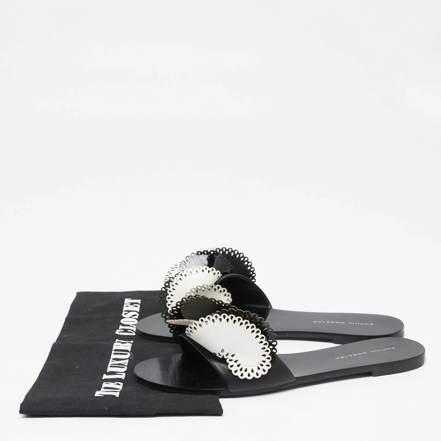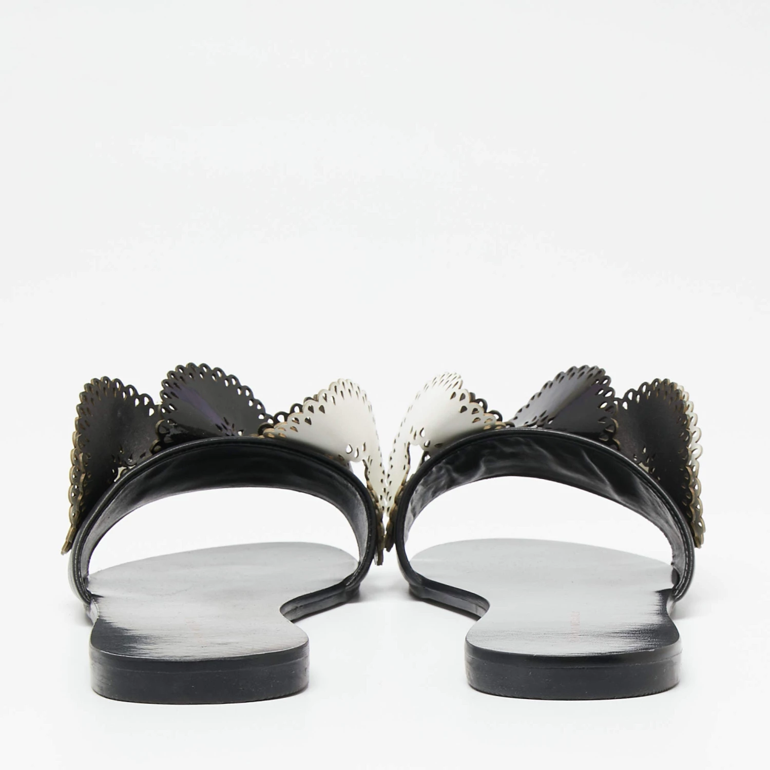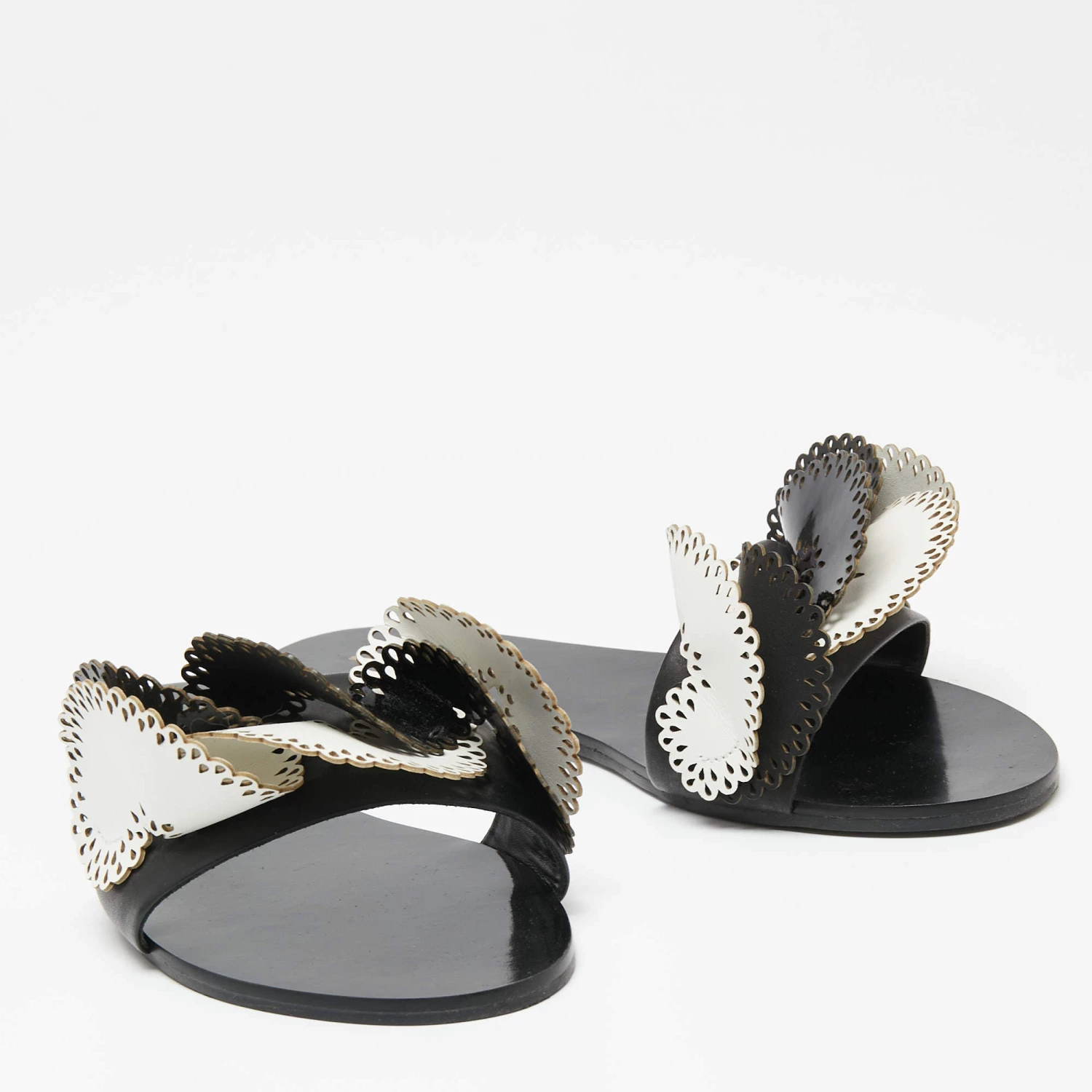This fabulous pair of slides will brighten up your outfit in no time. These Sophia Webster slides are patent and leather-made and they carry black and white shades. But what makes this pair so desirable are the beautiful laser-cut-detailed appliques on the uppers. This is definitely one pair that speaks beauty in a simple way.