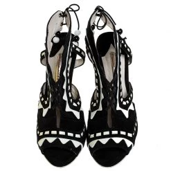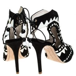 These sandals evidently exhibit why people in search for something exclusive go to Sophia Webster. These Rico sandals are crafted from black suede and white leather. They flaunt an intriguing cut out pattern all over along with a unique silhouette. These beauties are elevated with 12 cm high stiletto heels. Open toes and lace-ups at the counters complete this pair with utter charm.