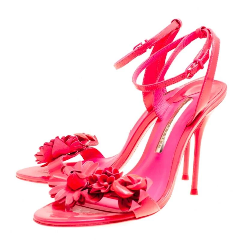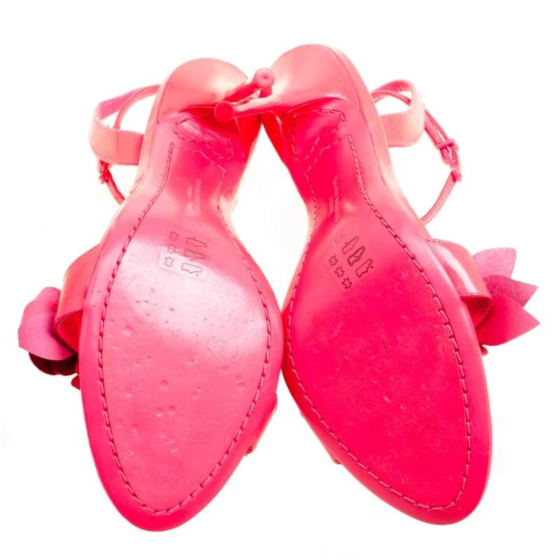 Sophia Webster has been a favourite worldwide for her uniques, creative and modern designs. She continues to charm us with these stunning Lilico sandals. These fluorescent pink sandals are crafted from patent leather and feature an open toe silhouette. They flaunt floral embellished vamp straps and buckled ankle wraps. Comfortable leather lined insoles and 10.5 cm stiletto heels complete this gorgeous pair.