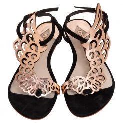 Let your style fly high with these flats from Sophia Webster! Beautifully crafted from black suede, they feature open toes, buckle ankle straps, and a gold patent leather butterfly design on the vamps. You’re sure to love owning this gorgeous pair.