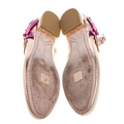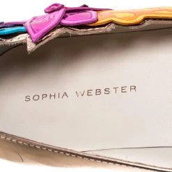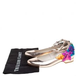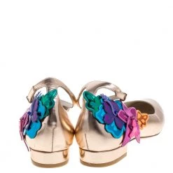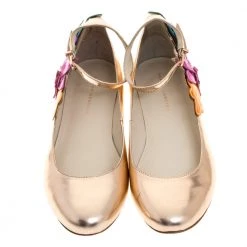 Get yourself a sweet update with these ballet shoes designed by Sophia Webster. This rounded flat pair of shoes is made from metallic bronze leather and decorated with colorful flowers. It is closed with the sleek buckle strap on the ankle and finished with lined insoles.