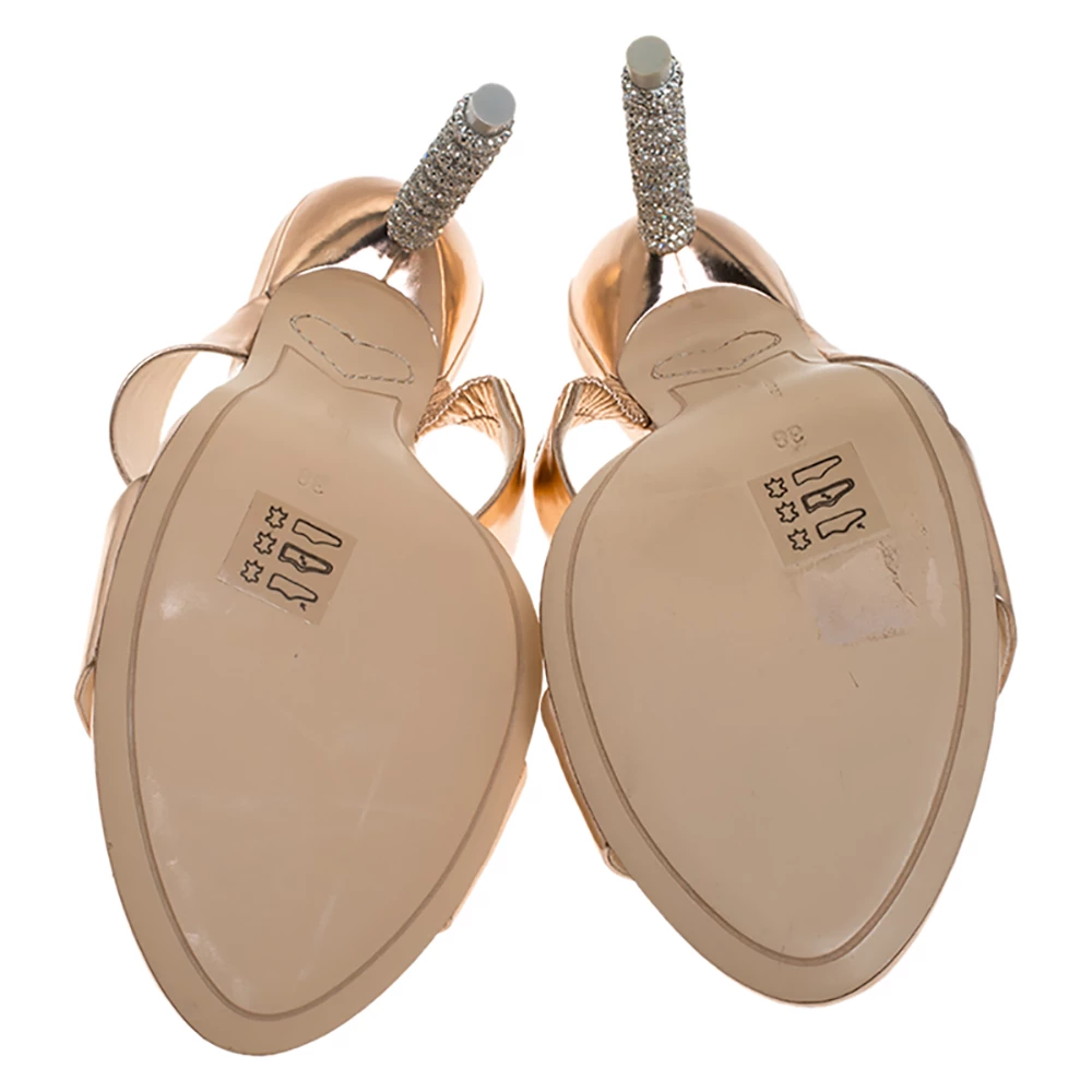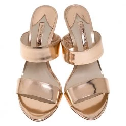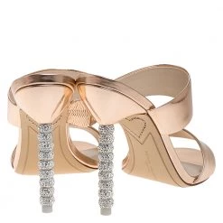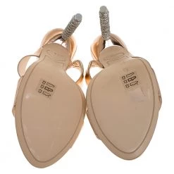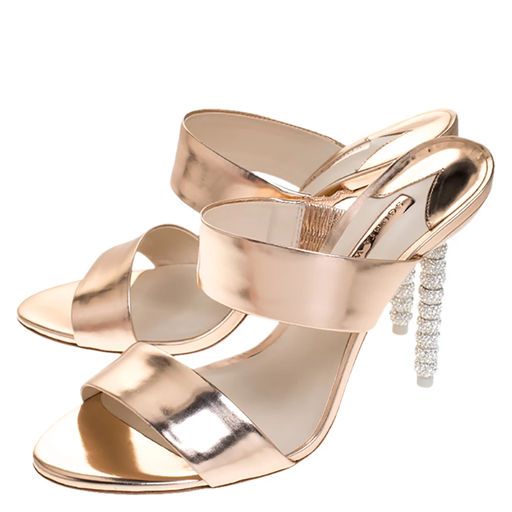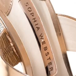 These sandals from Sophia Webster are bearers of a fine mix of shoe craftsmanship and style. The leather sandals carry a simple design with open toes and 10.5 cm heels detailed with crystals. The leather insoles are stamped with the brand label.