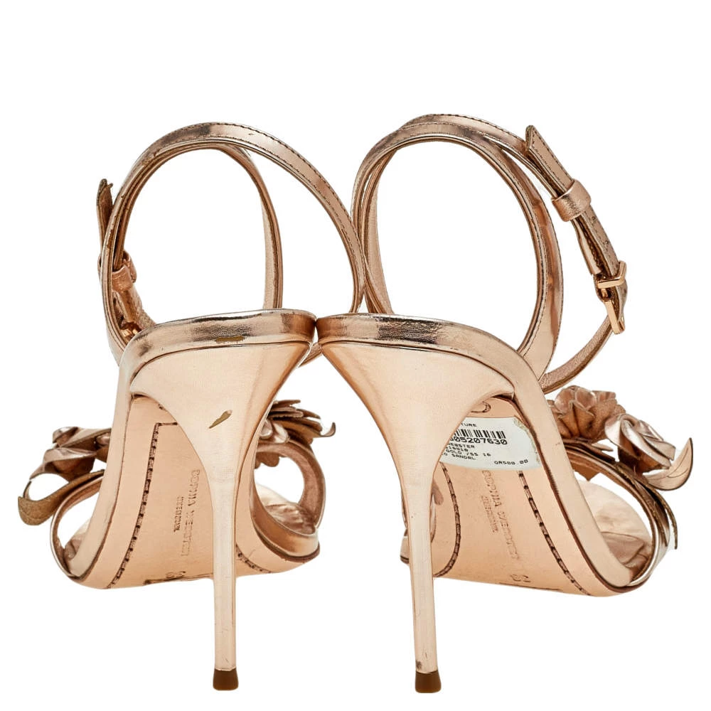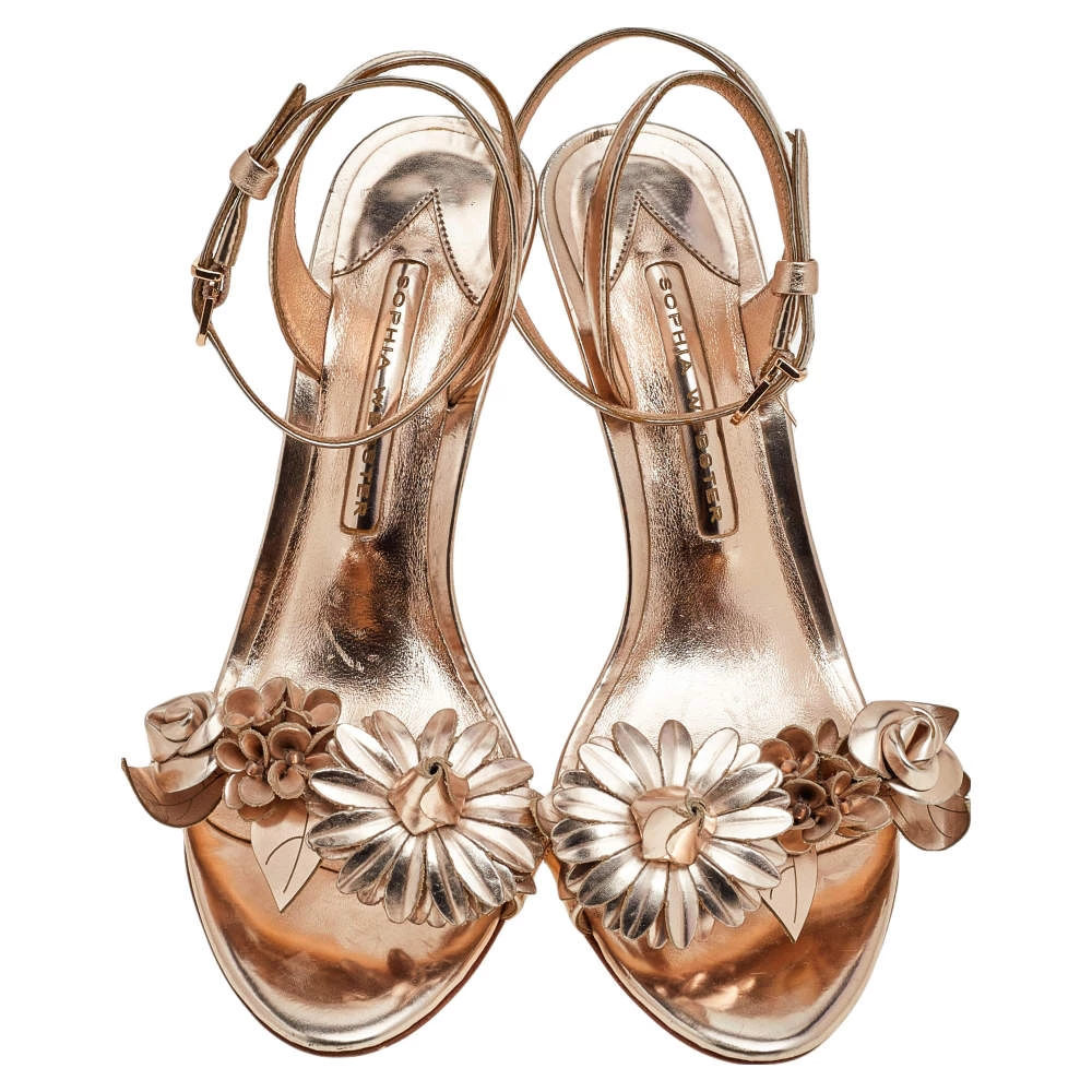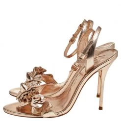 How attractive are these sandals from Sophia Webster! Created using metallic gold leather and enhanced with matching floral embellishments on the upper, these sandals look absolutely glamorous and appealing. They flaunt rose-gold toned hardware, a slingback, and super slim heels.
