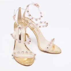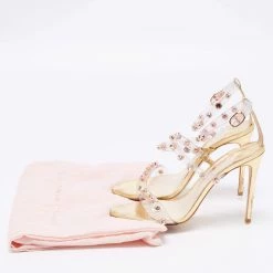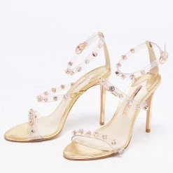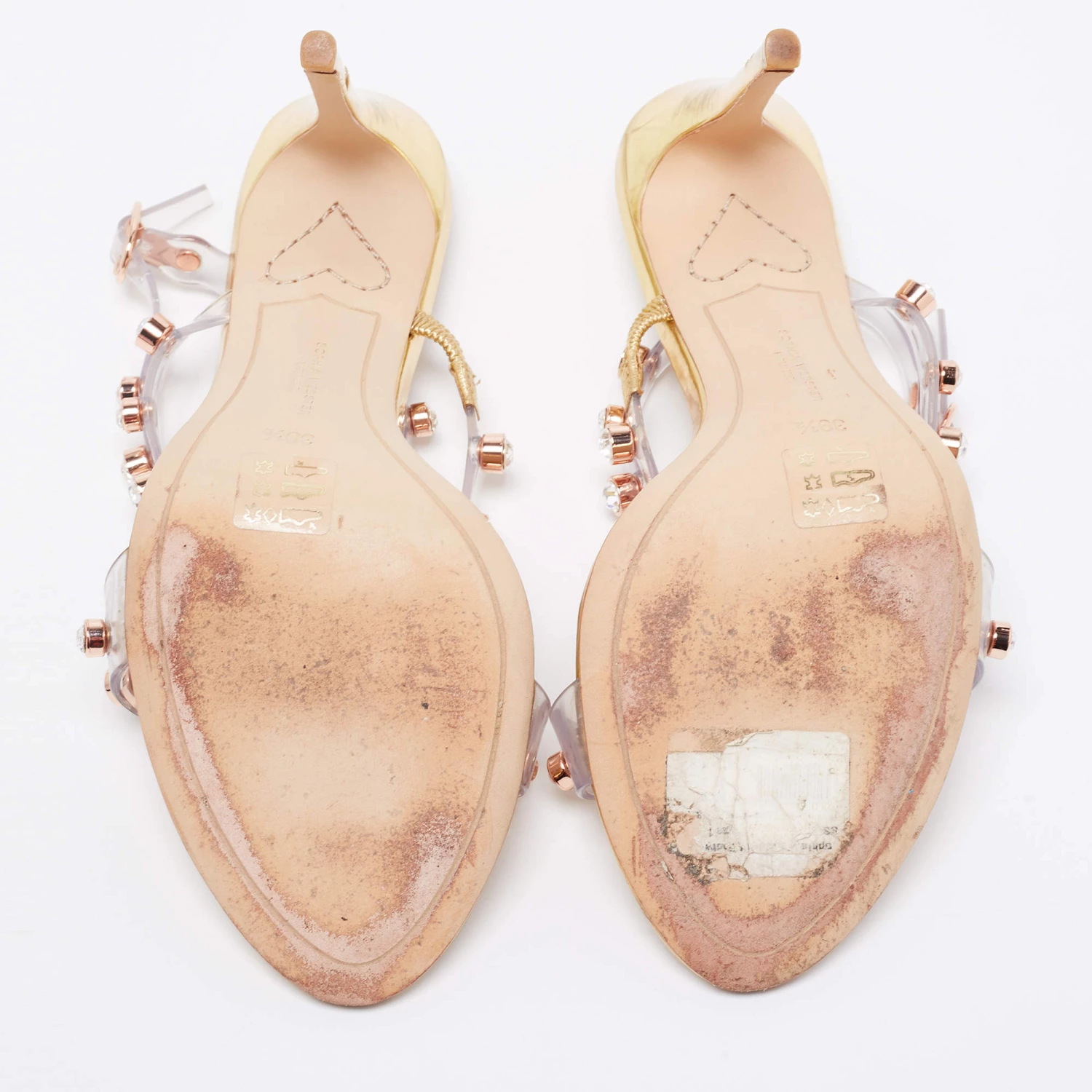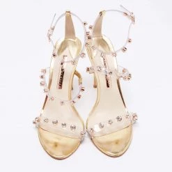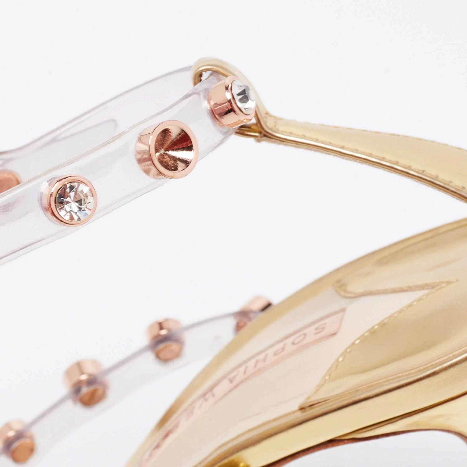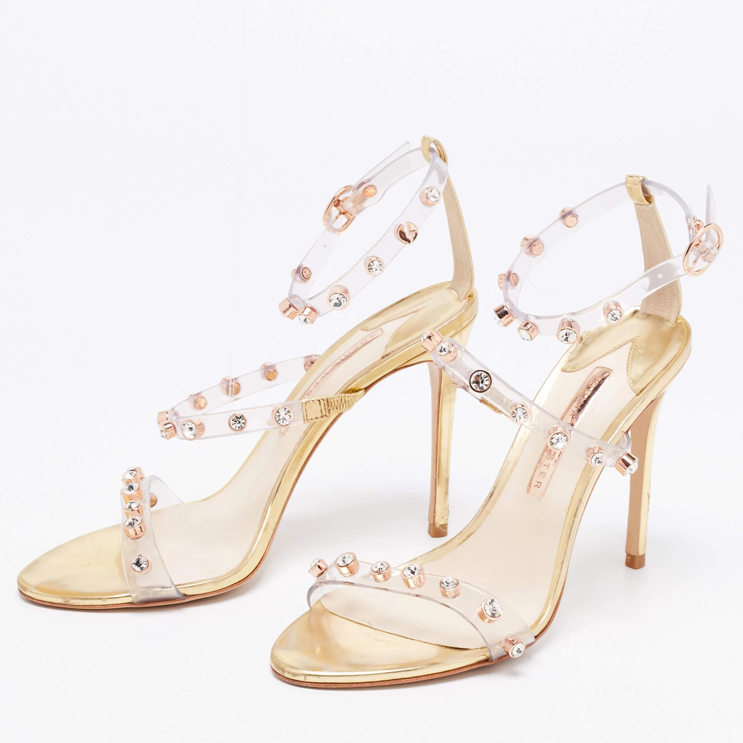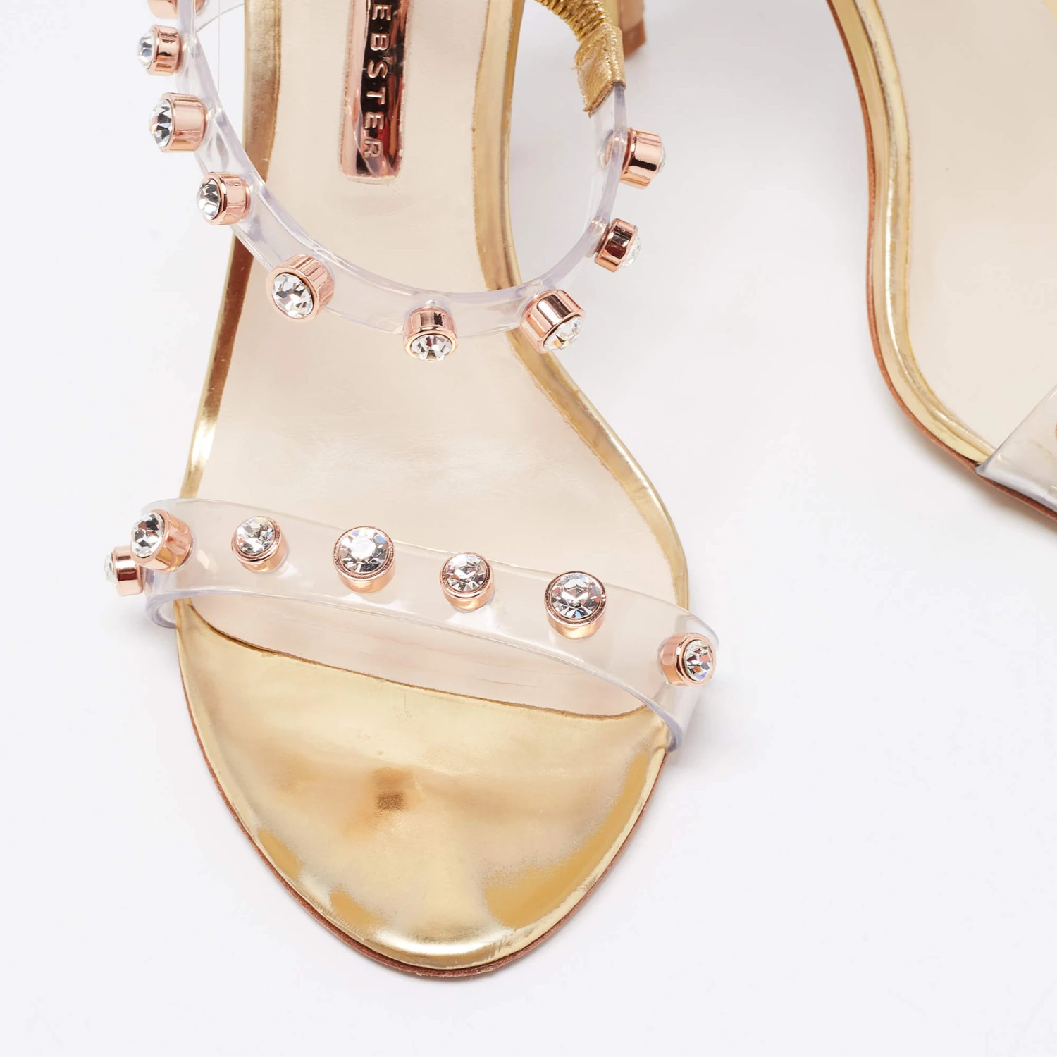 These Rosalind sandals from Sophia Webster are all about flaunting eternal class and elegance! They are made from metallic-gold PVC and leather, which are embellished with crystals. They feature open toes, an ankle strap, and tall heels. Show off your chic style with these gorgeous sandals.