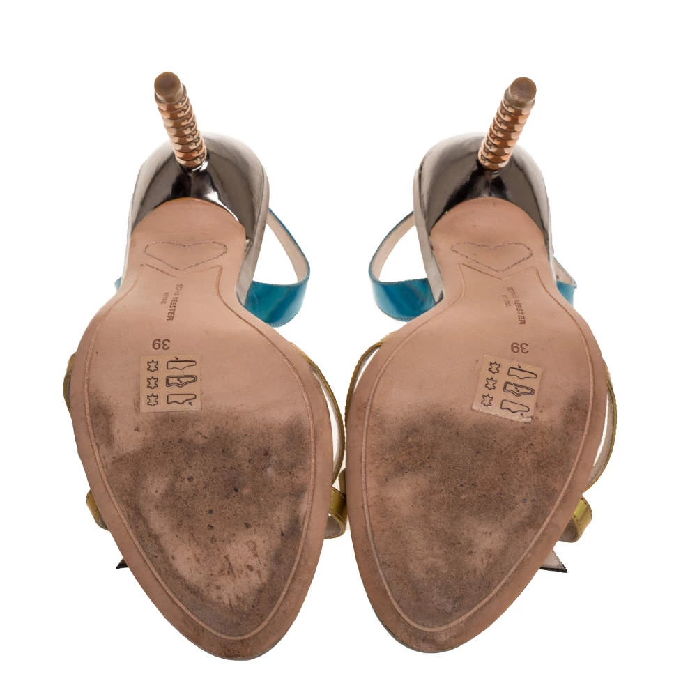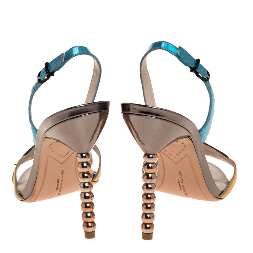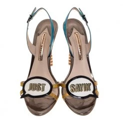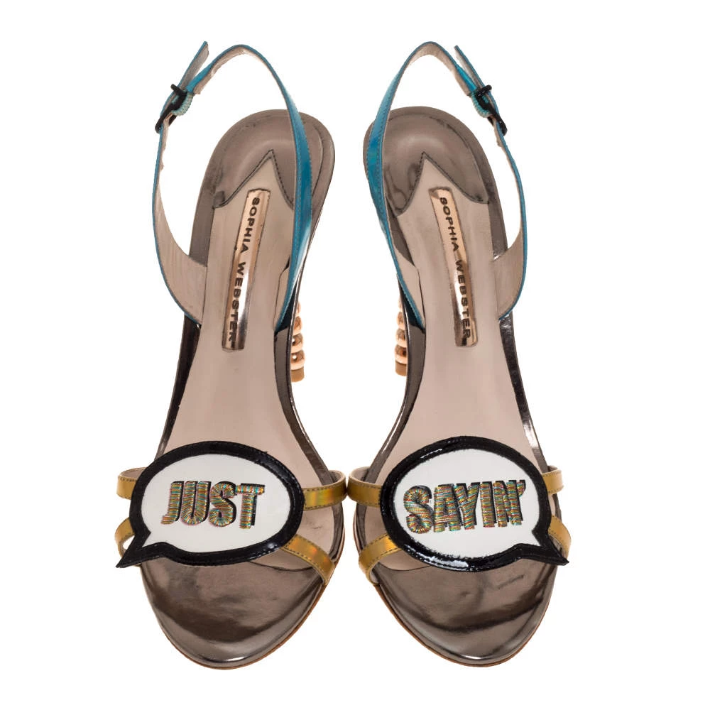 These Sophia Webster sandals are crafted from leather in Italy. They have a mix of colours, open toes, vamps carrying the words “Just Saying” on the vamps, slingback straps and 11 cm heels.