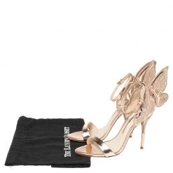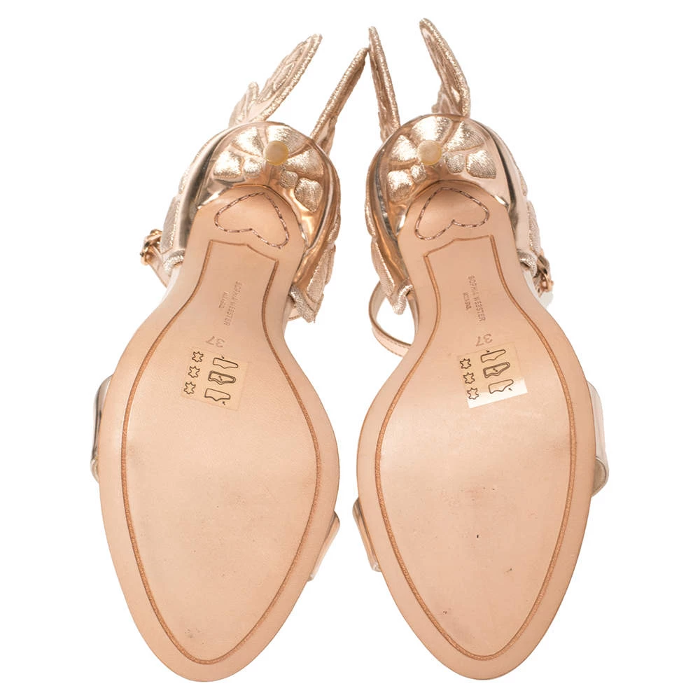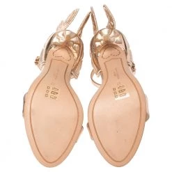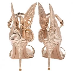 When it comes to dreamy, modern designs, Sophia Webster tops our list! We are charmed yet again with these metallic rose Chiara Butterfly sandals that are crafted from leather into an open toe silhouette. They flaunt single vamp straps and buckled ankle straps. The heel counters are detailed with wings that extend out beautifully making the pair look amazing. They are set on 10.5 cm heels.