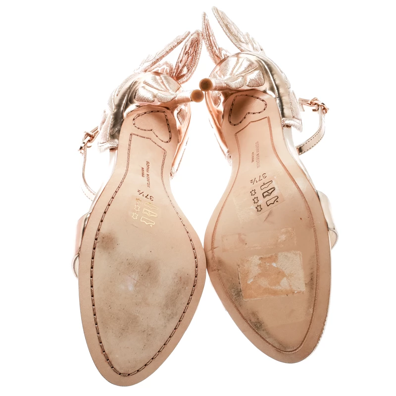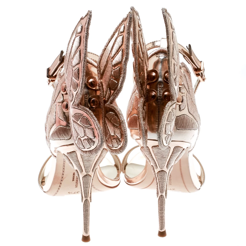 When it comes to quirky, stylish and modern designs, Sophia Webster tops our list! She charms us yet again with these metallic rose gold Chiara Butterfly sandals that are crafted from leather and feature an open toe silhouette. They flaunt single vamp straps and buckled ankle straps. The heel counters are shaped to resemble that of a butterfly’s wing and the wings extend out beautifully making the pair look amazing. They come equipped with comfortable leather lined insoles and 11 cm stiletto heels. Pair them with skirts or knee-length dresses for your special outings.