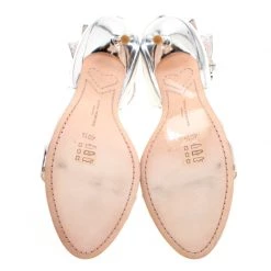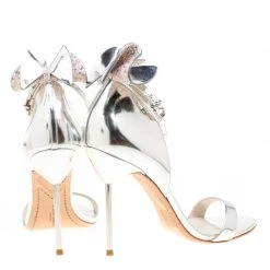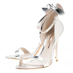 Jazz up your party wear looks with ease by adding these fun and flirty Sophia Webster open toe sandals to your look. Crafted in metallic silver leather, these sandals feature a slender front strap along with an ankle strap and covered counters that are gorgeously adorned with bow details decorated with crystals. Complete with 11.5 cm high stiletto heels, this one will truly complement the fashionista in you.