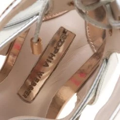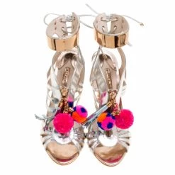 Much loved and an absolute favourite, Sophia Webster continues to charm us with her gorgeous designs and these Yasmina sandals are no exception. The metallic silver sandals are crafted from mrrored leather and feature an open toe silhouette. They flaunt a cutout strap design with a rose gold zip closure detailing in the middle and cute pom pom zippers, ankle cuffs with self tie-ups at the back and 10.5 cm quirky heels. Comfortable leather lined insoles complete this stunning pair. Match them with high waisted trousers or asymmetrical skirts for your special occasions.
