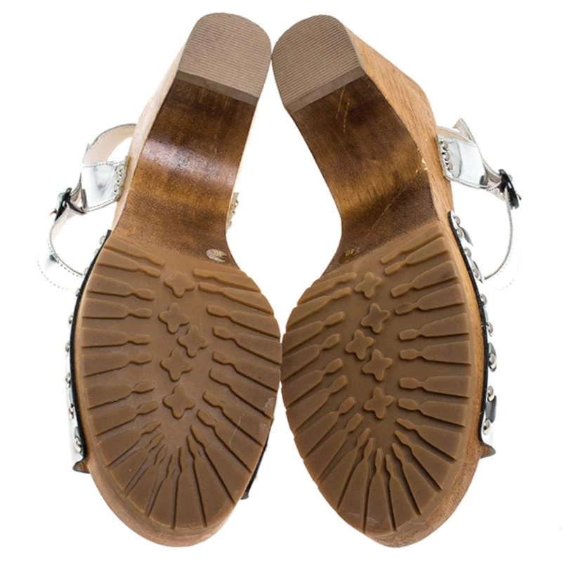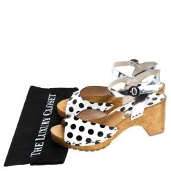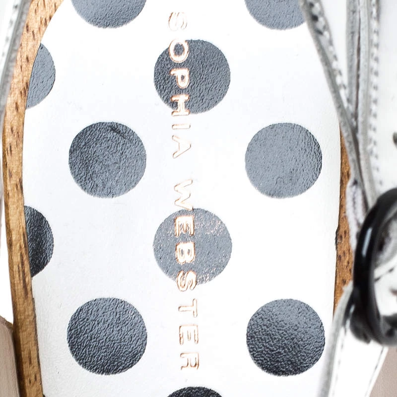 Sweetly complementing your short dresses for casual outings, these Ava sandals from Sophia Webster are crafted with leather featuring monochrome polka dots on the frontal straps and silver ankle straps with buckle fastening. Set on an 8 cm wooden heels and platforms, these are complete with rubber soles that offer maximum grip.