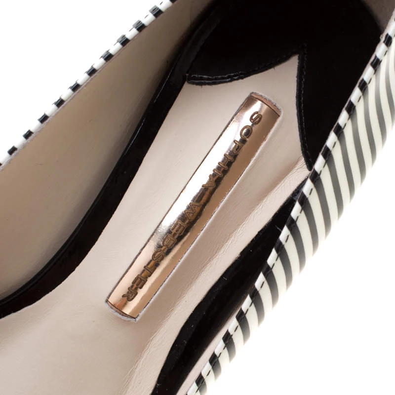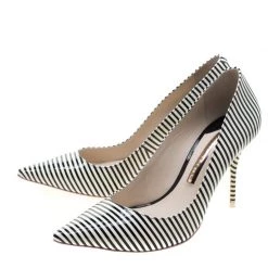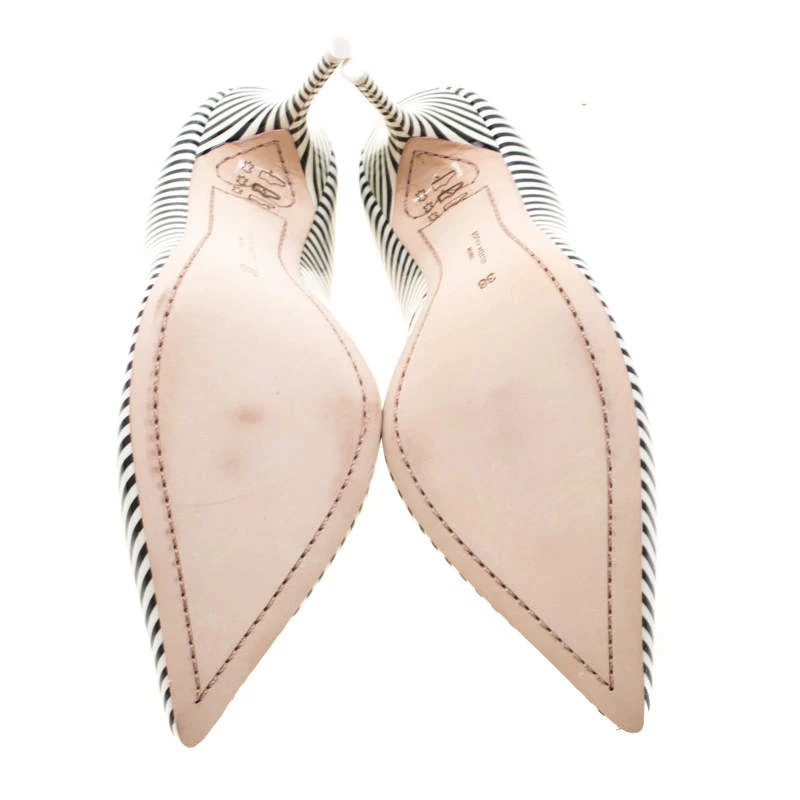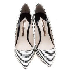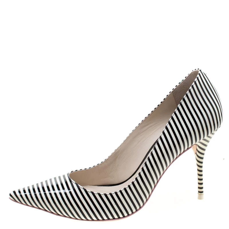 Jazz up your everyday look by flaunting these pointed toe pumps crafted from patent leather. With this pair, Sophia Webster brings to you a design that reflects the trends of the season. Bid goodbye to monotony and get this new striped pair.