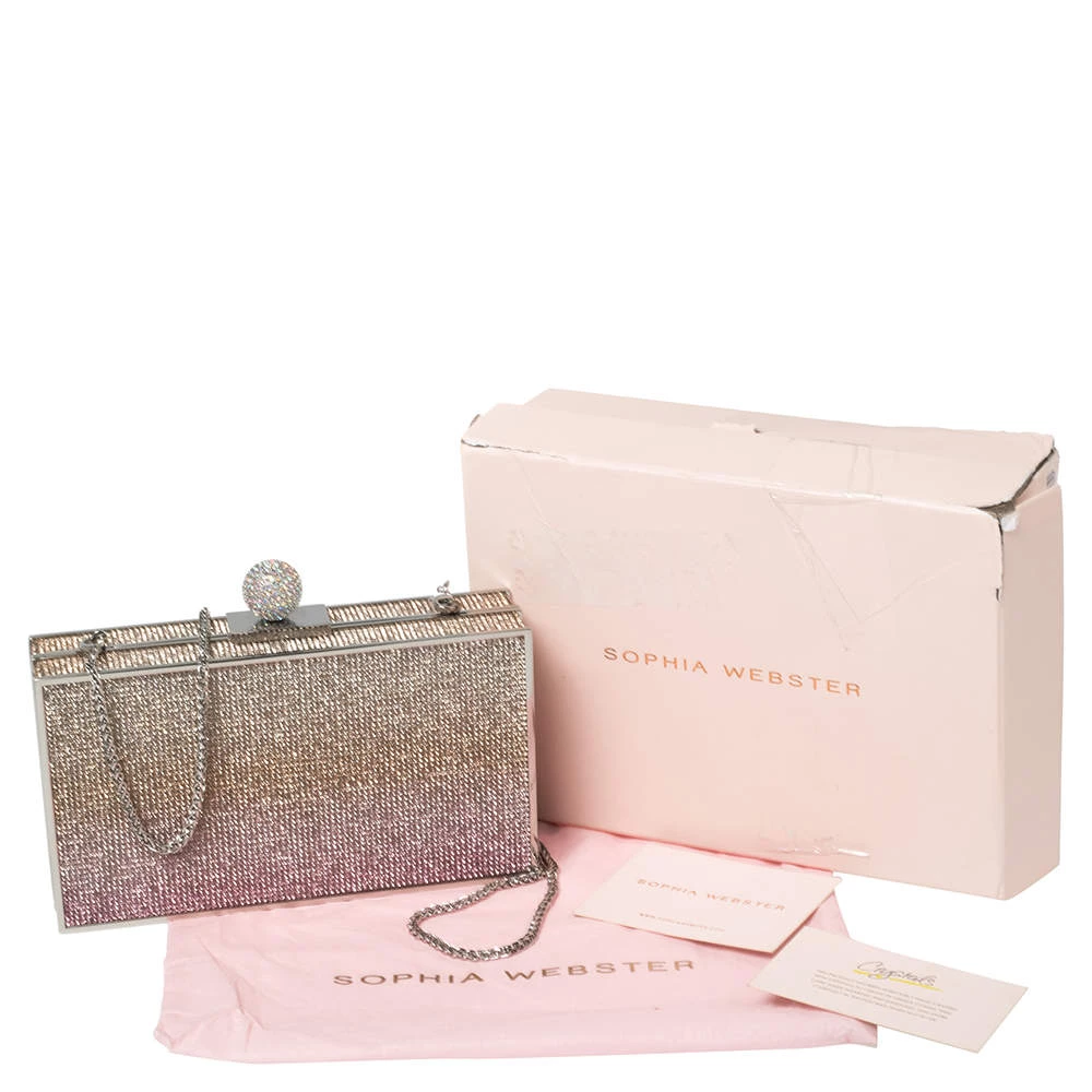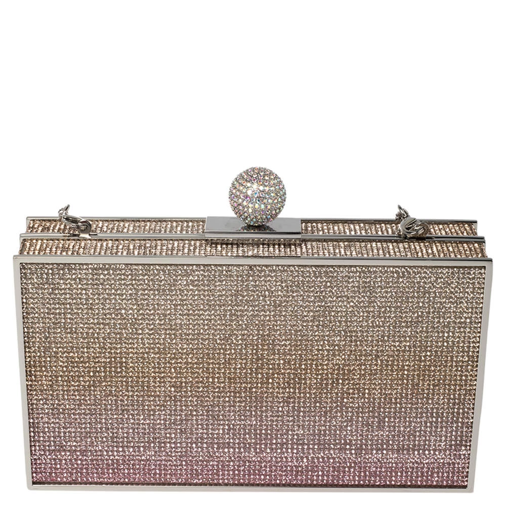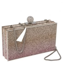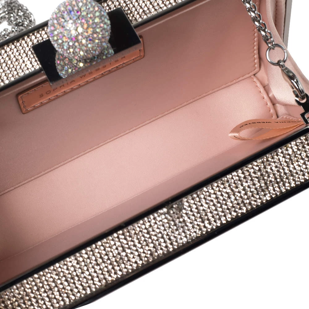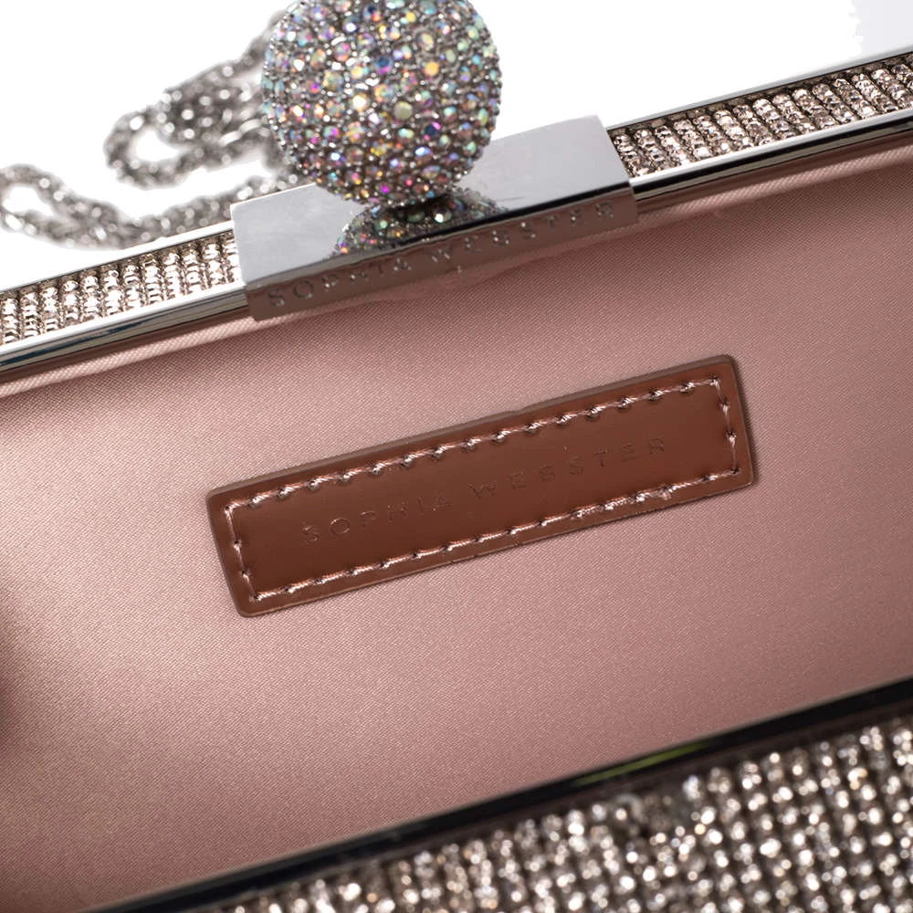 This beautiful Clara box clutch from Sophia Webster will charm you with its striking details. The clutch is crafted using rose gold-tone hardware and embellished with crystals all over the PVC body. On the top is a crystal-studded ball that acts as the clasp and gives way to the satin-lined interior. Carry it with a cocktail dress and pointed stilettoes to win praises!