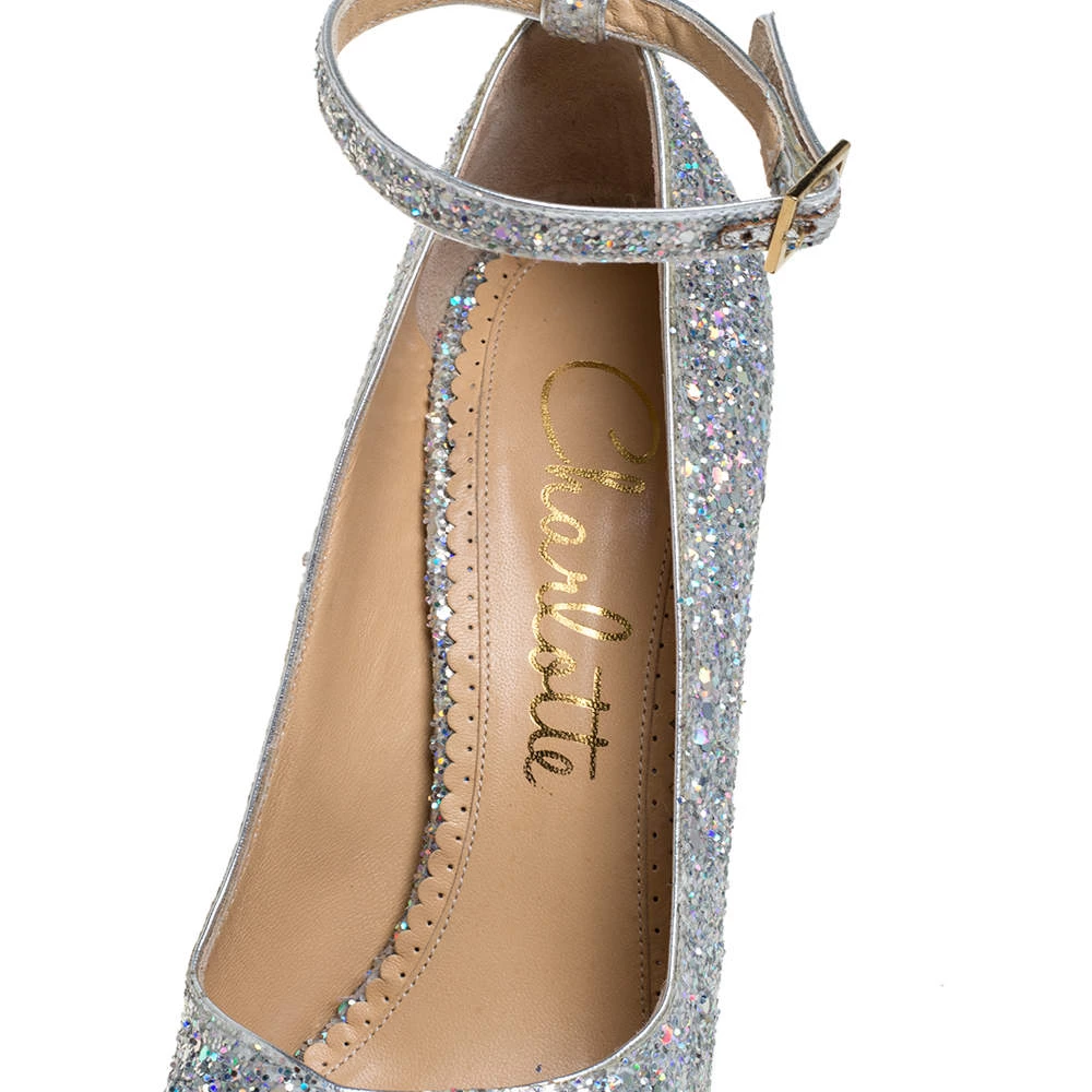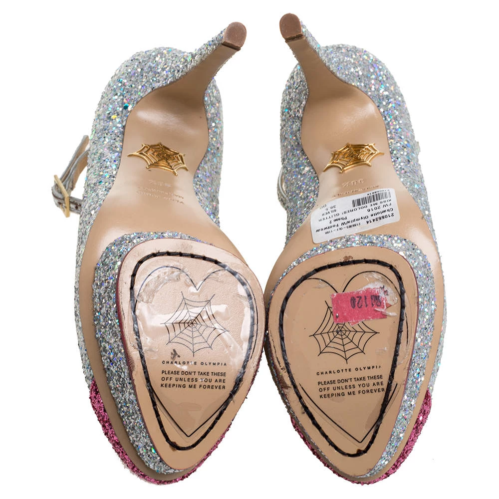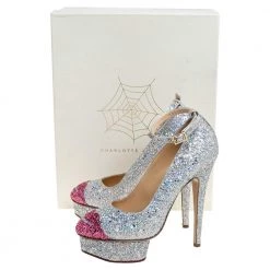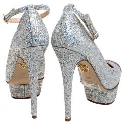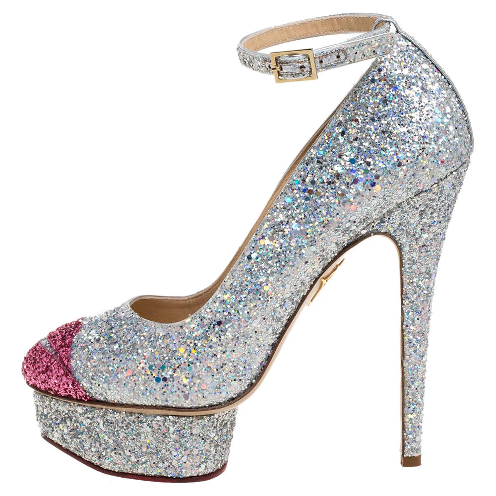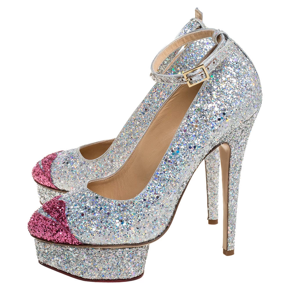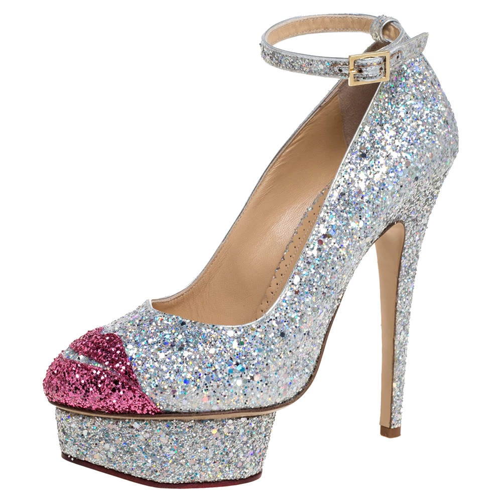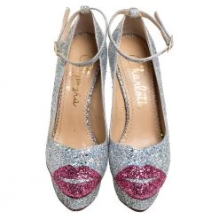 Charlotte Olympia brings forth a shimmery wonder in the shape of these pumps that can easily glitter their way into your wardrobe. These shoes are designed with stiletto heels, ankle straps with buckle closure, and lip motifs on the toes.