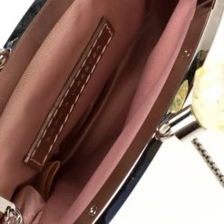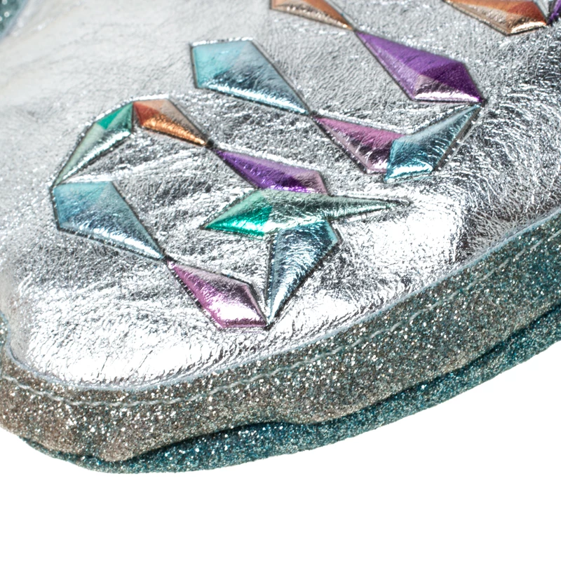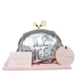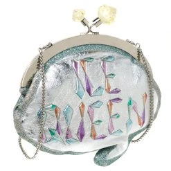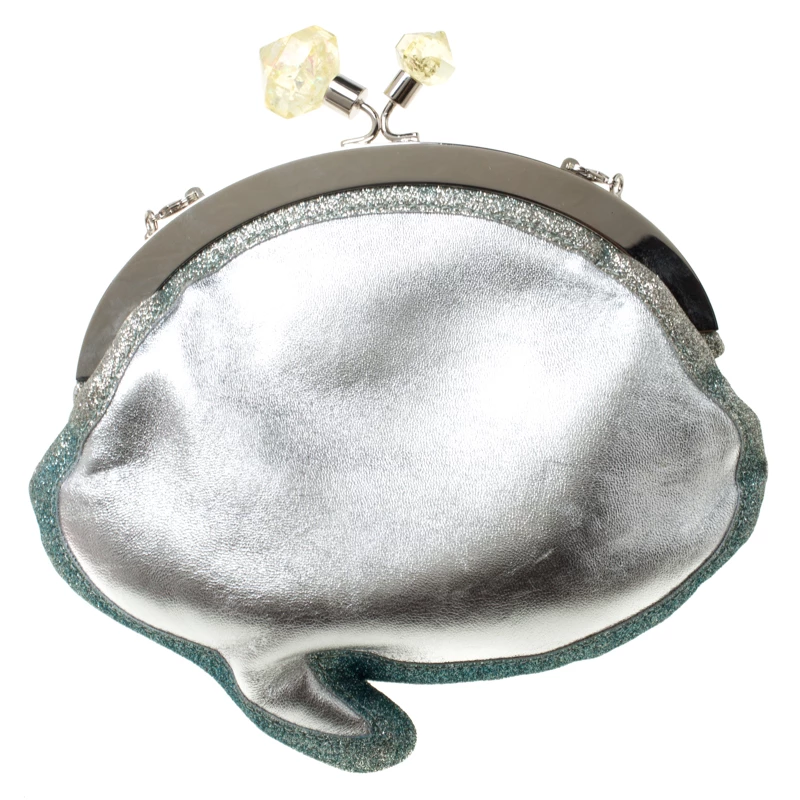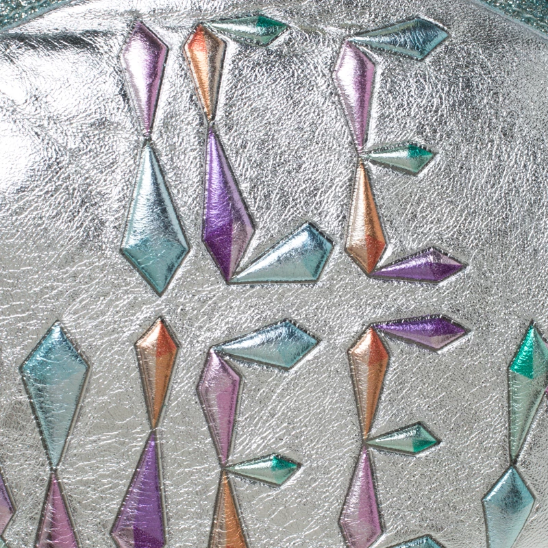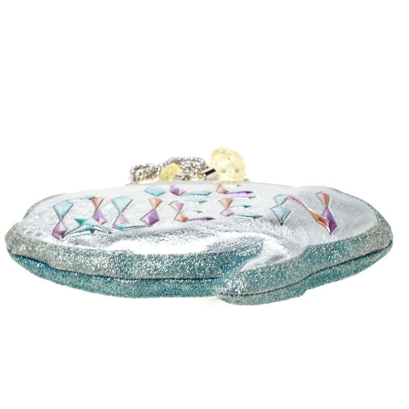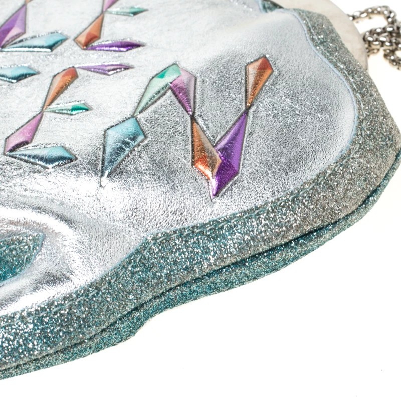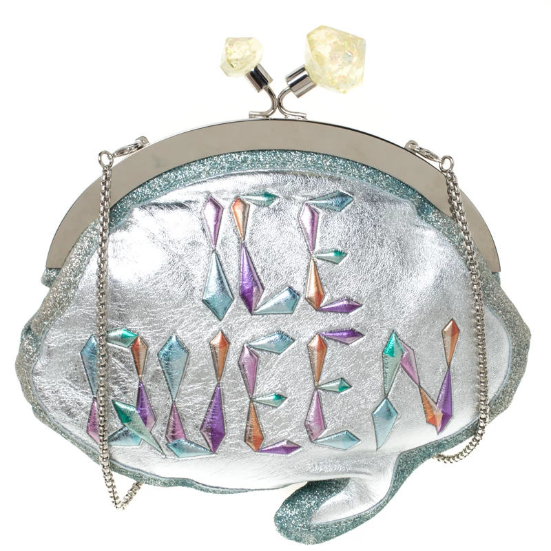 Shaped like a speech bubble and adorned with multicolored ‘Ice Queen’ print at the front, this clutch by Sophia Webster is statement-creation that you must own. Rendered in glitter leather, the clutch has a top liss-lock closure which opens to a fabric-lined interior. This unique creation is complete with a chain-link shoulder strap.