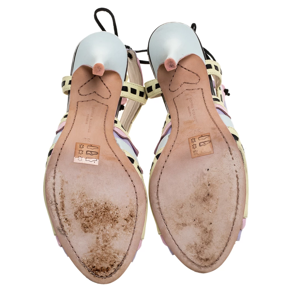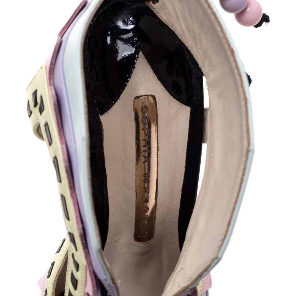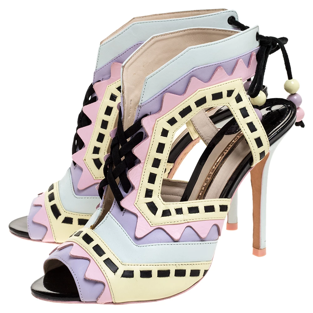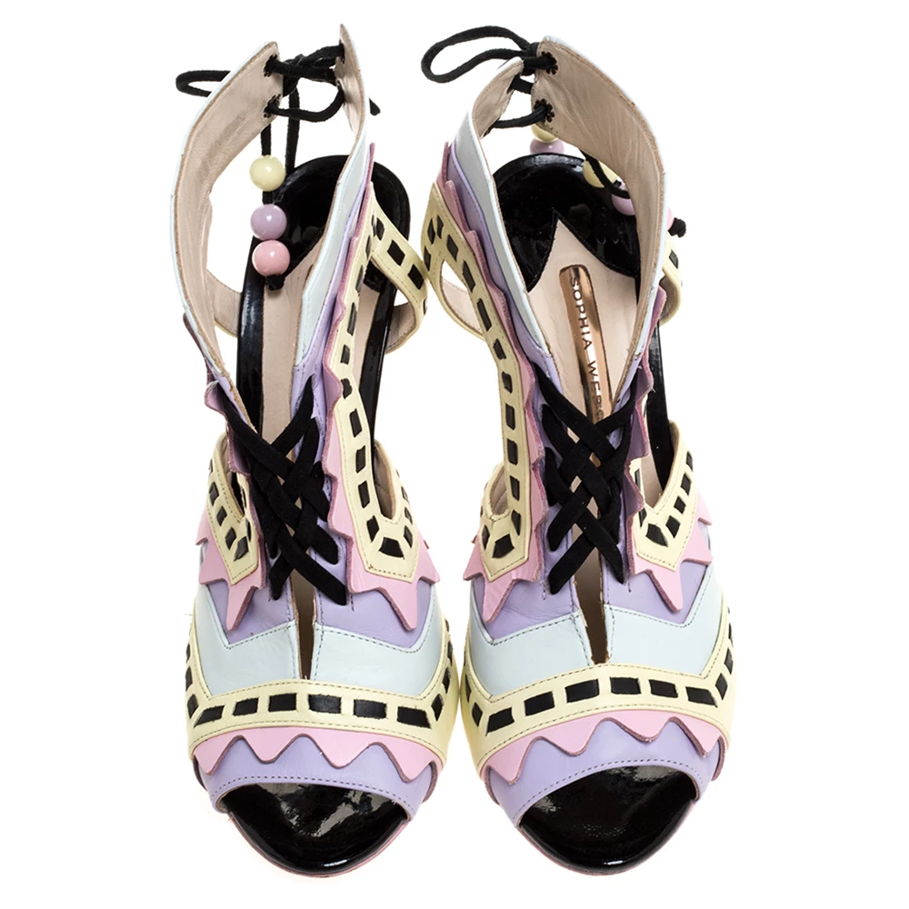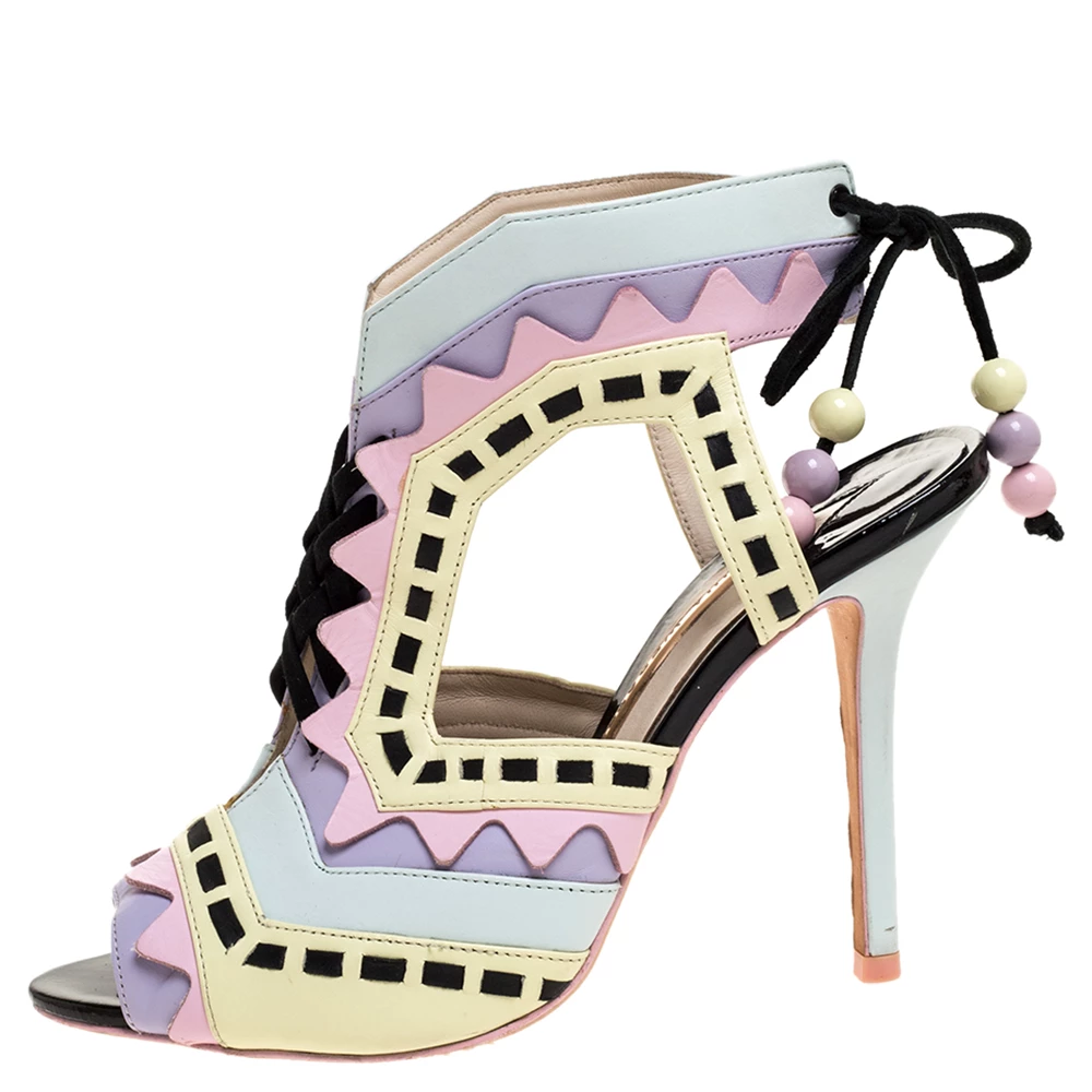 These sandals evidently exhibit why people in search of something exclusive go to Sophia Webster. These Rico sandals are crafted from colorful leather. They flaunt an intriguing cut out pattern all over along with a unique silhouette. These beauties are elevated with 11 cm high stiletto heels. Open toes and lace-ups at the counters complete this pair with utter charm.
