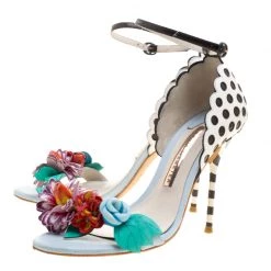 Jazz up your day time party wear looks with ease by adding these fun and flirty Sophia Webster open toe sandals to your look. Crafted in multicoloured leather details along with leather lilico floral embellishment at the front, these sandals feature a black leather ankle strap along with black and white striped heels.