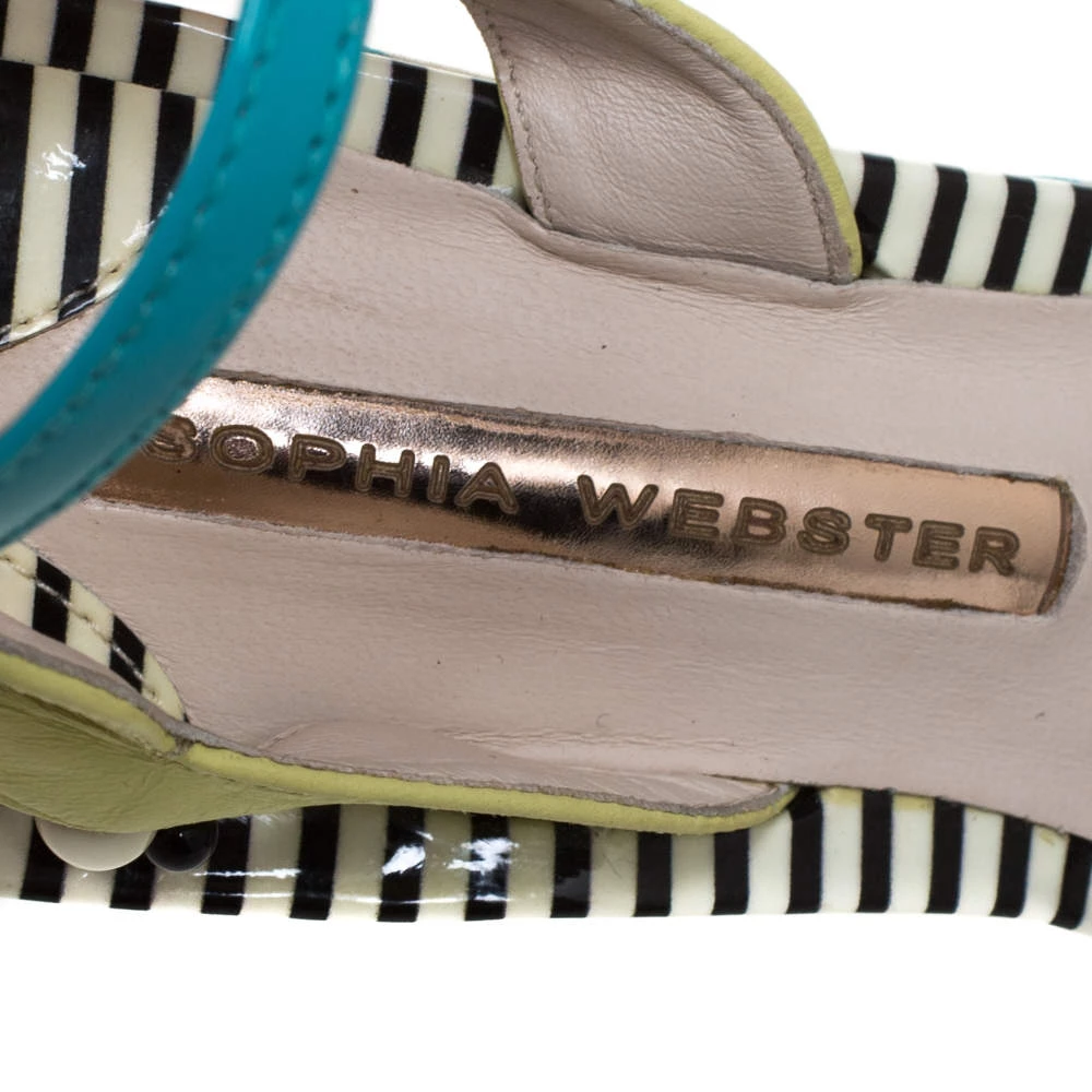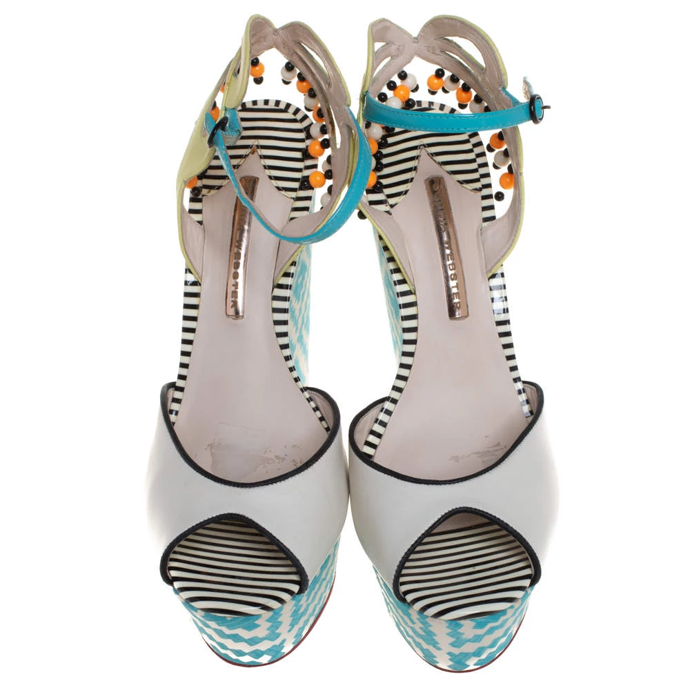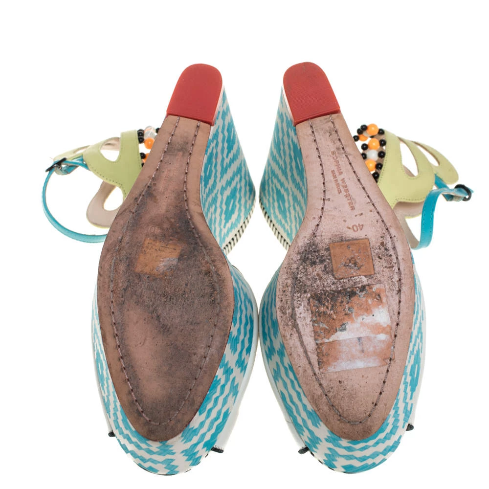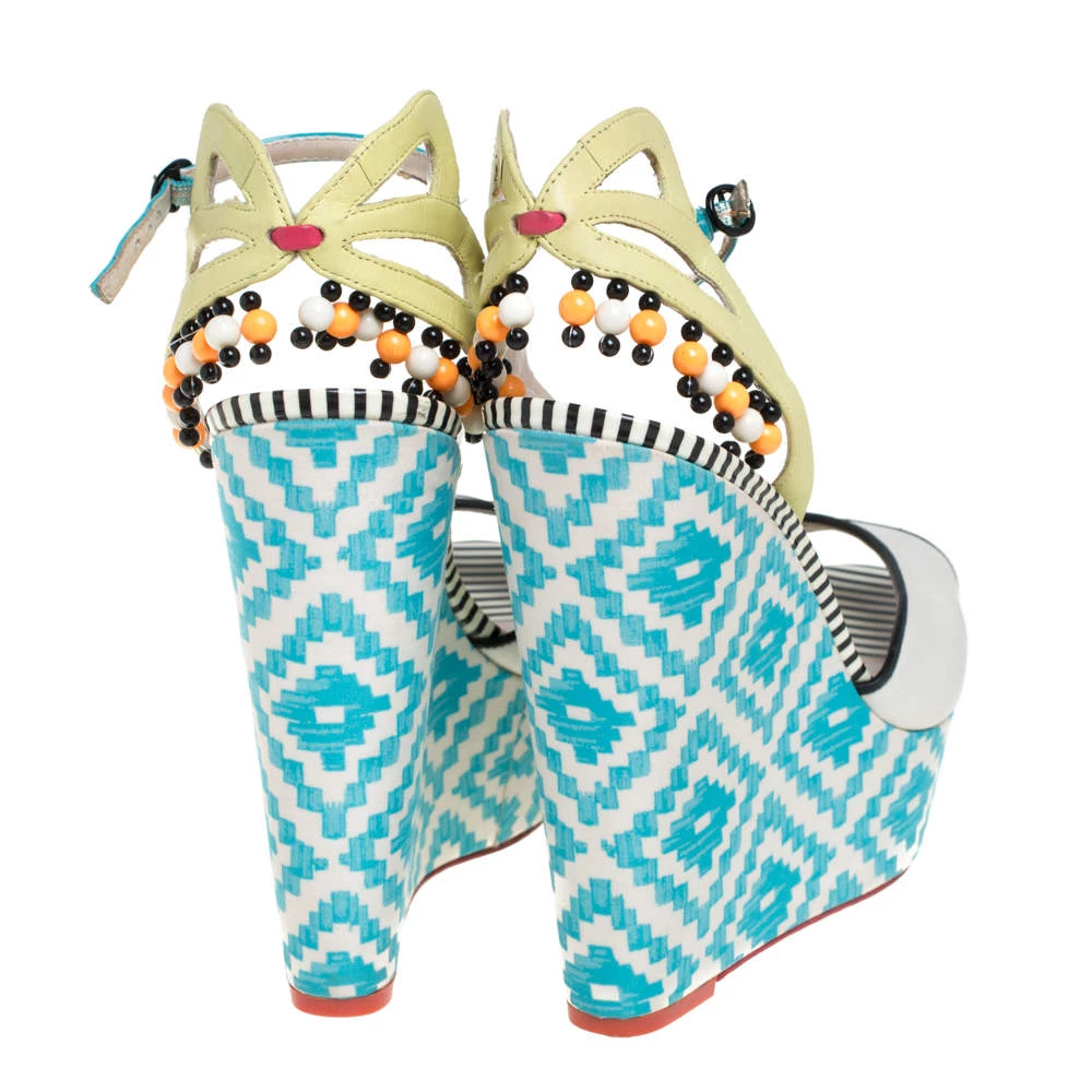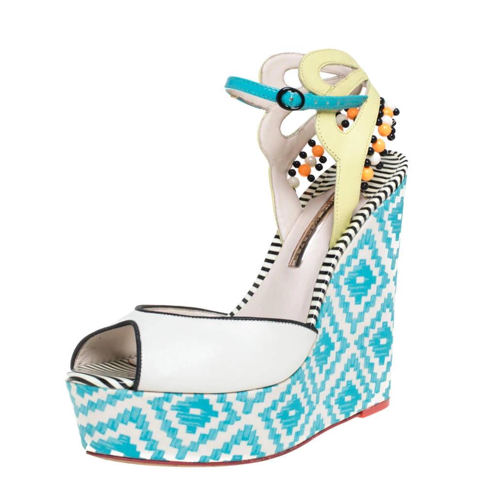 Step out in style with these Sophia Webster wedge sandals crafted using canvas and leather. The shoes come with colorful prints, embellishments, open toes, and buckle closure. They are set on 15 cm wedge heels for a comfortable lift.