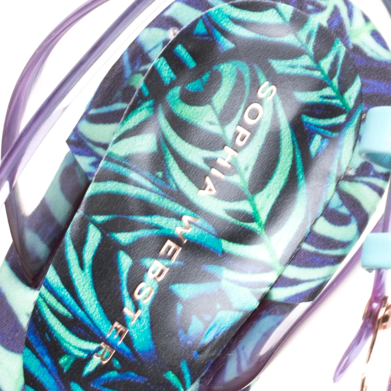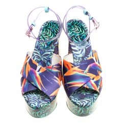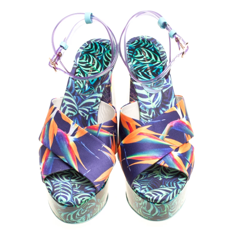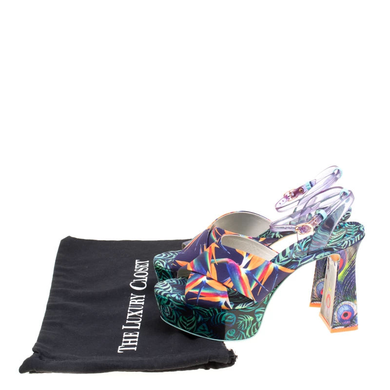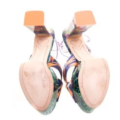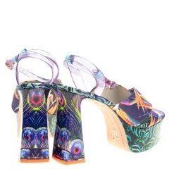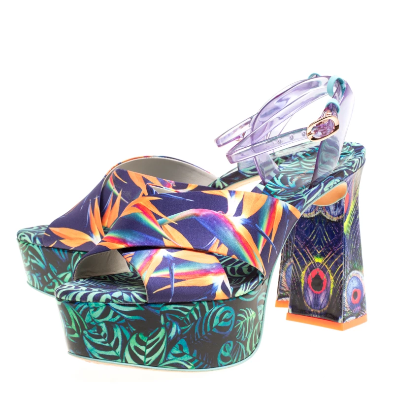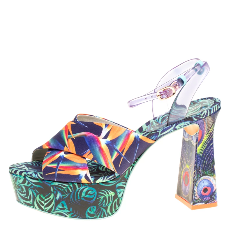 It time to go bold and glamorous with these exotic Effie sandals from Sophia Webster. These sandals are crafted from satin and feature a multicolour tropical print consisting of peacock feathers and flowers all over them. Flaunting an open toe silhouette, they come equipped with crossover vamp straps, PVC buckled ankle straps and leather lined insoles. The solid platforms and 11.5 cm block heels ensure you dance in them all night long!