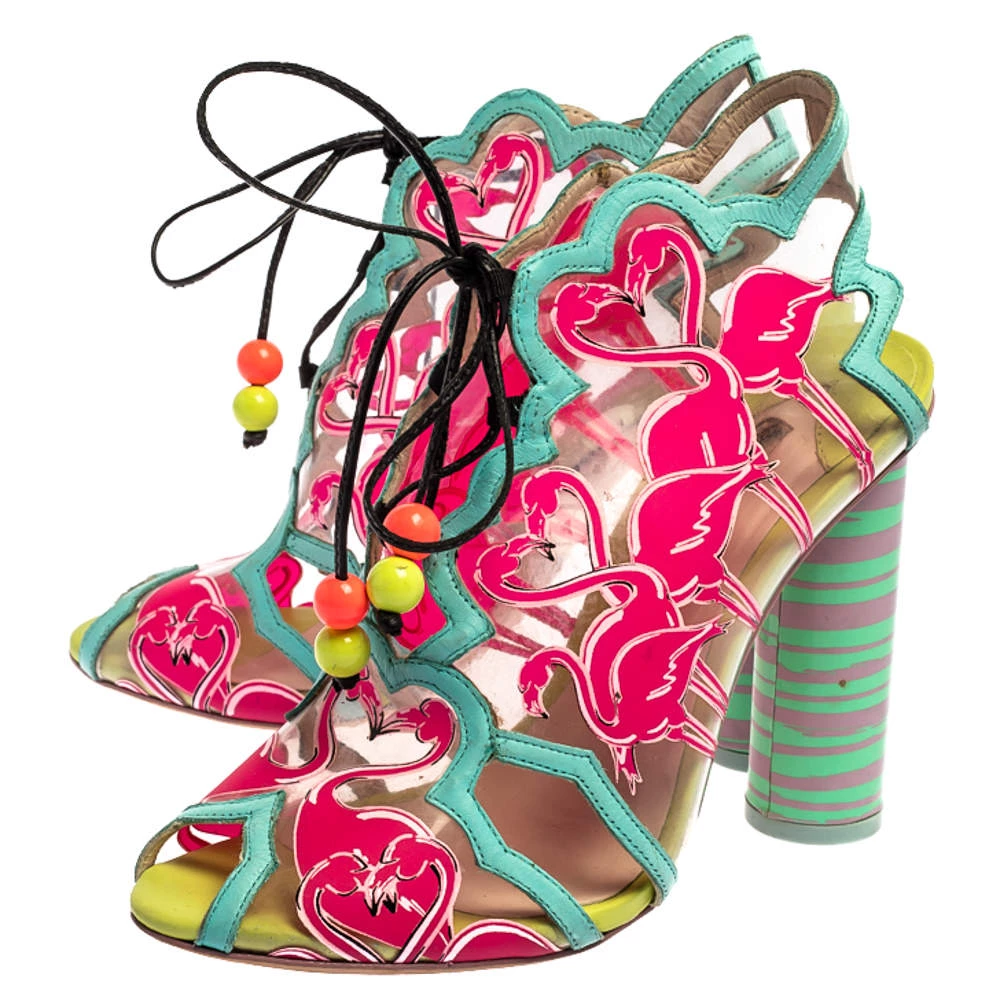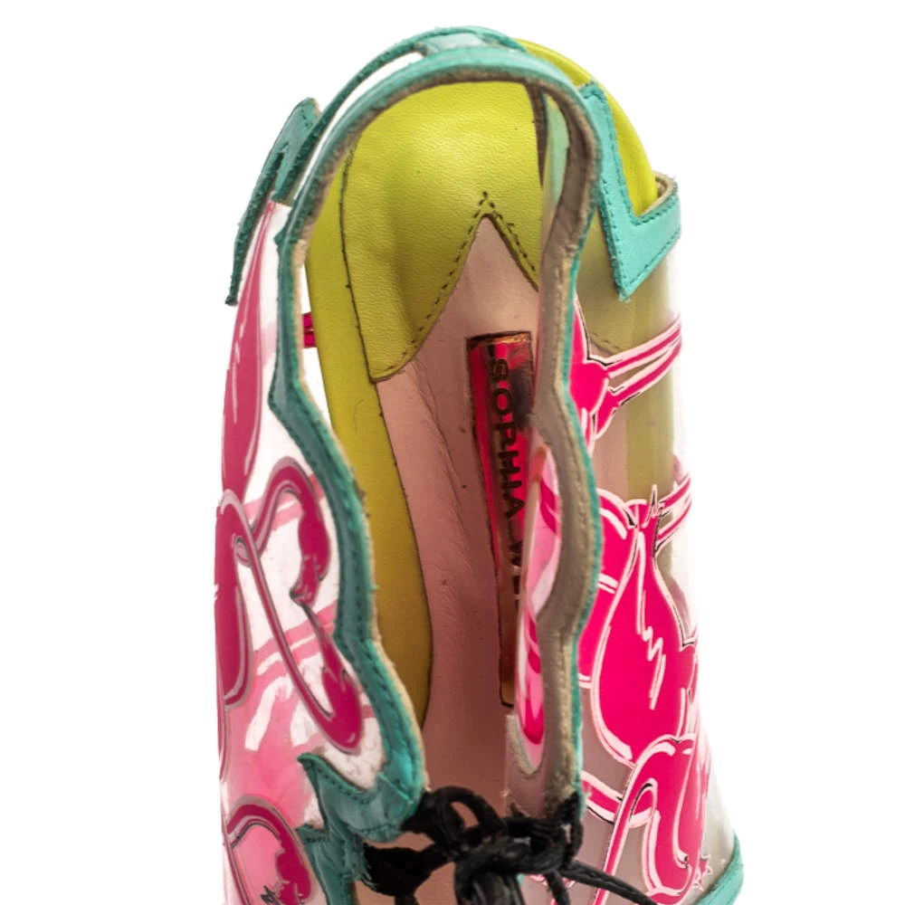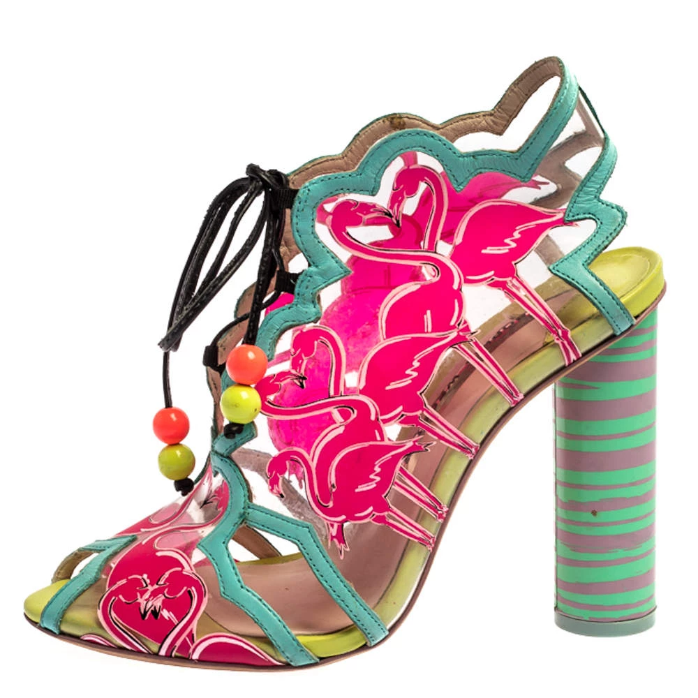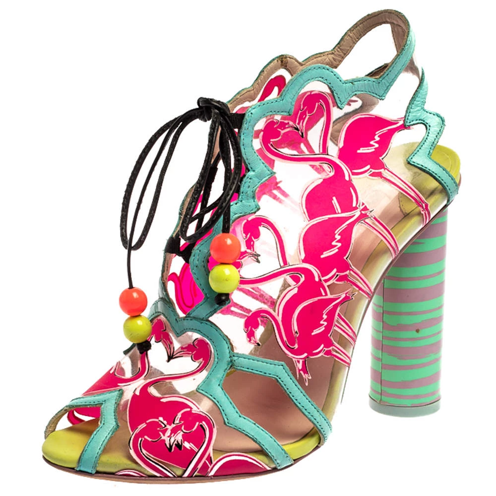 Say yes to these gorgeous Sophia Webster sandals and take your style quotient a notch up. Designed in a unique silhouette with gorgeous heels, these multicolored sandals feature leather Flamingo motifs on the clear PVC panels. They are complete with ankle tie-up fastenings. Team those knee-length dresses with this gorgeous pair for your fashionable outings.