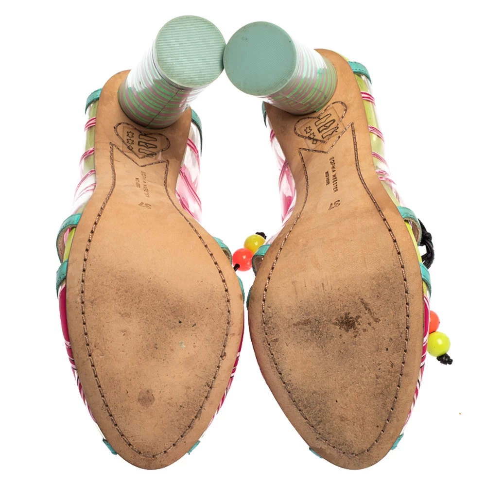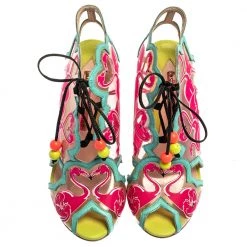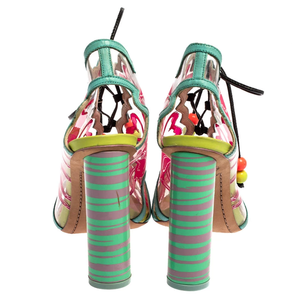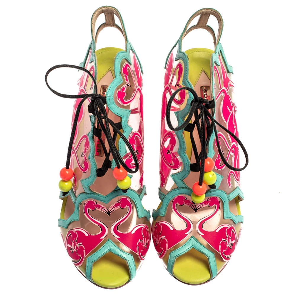 Say yes to these gorgeous Sophia Webster sandals and take your style quotient a notch up. Designed in a unique silhouette with gorgeous heels, these multicolored sandals feature leather Flamingo motifs on the clear PVC panels. They are complete with ankle tie-up fastenings. Team those knee-length dresses with this gorgeous pair for your fashionable outings.