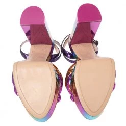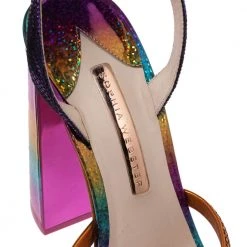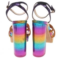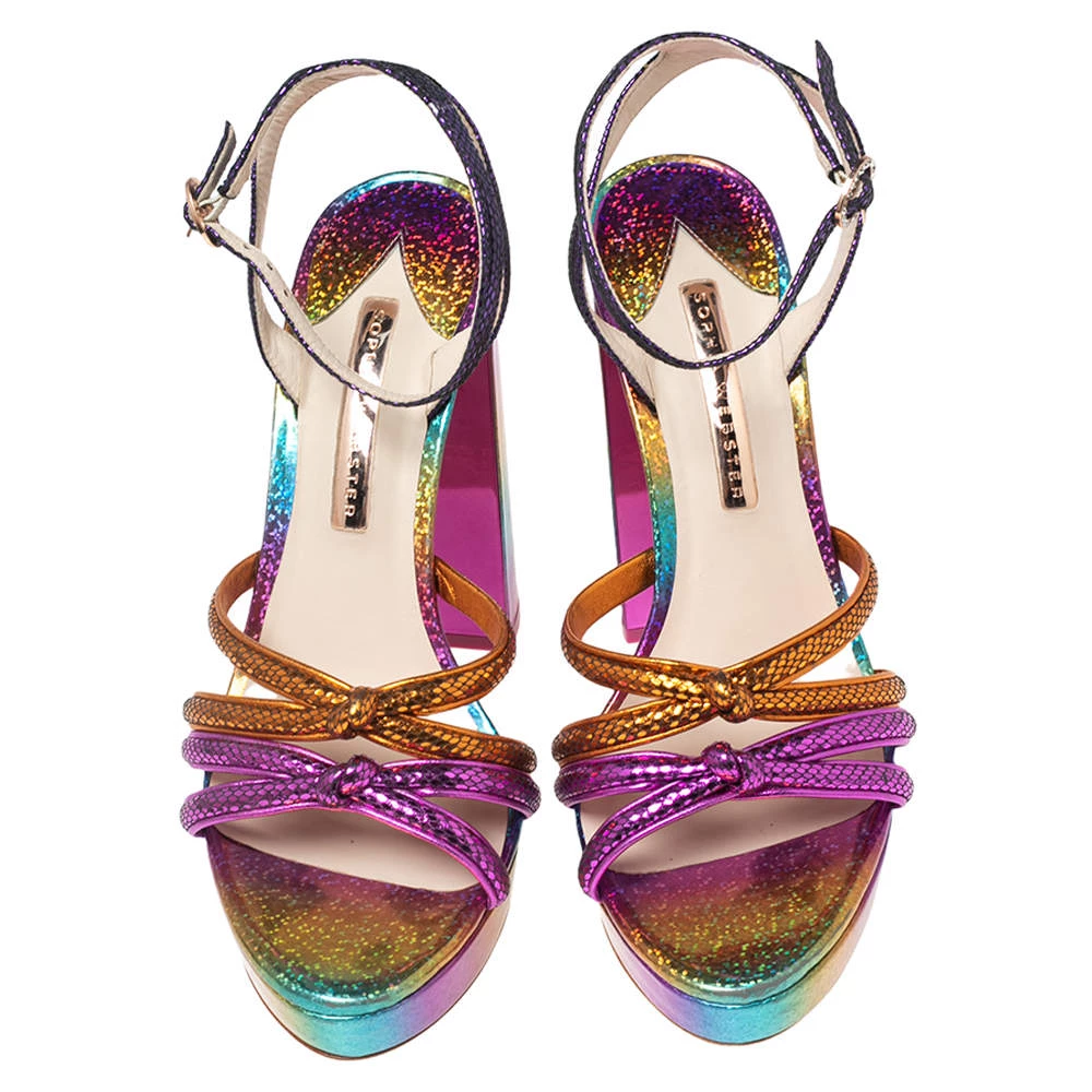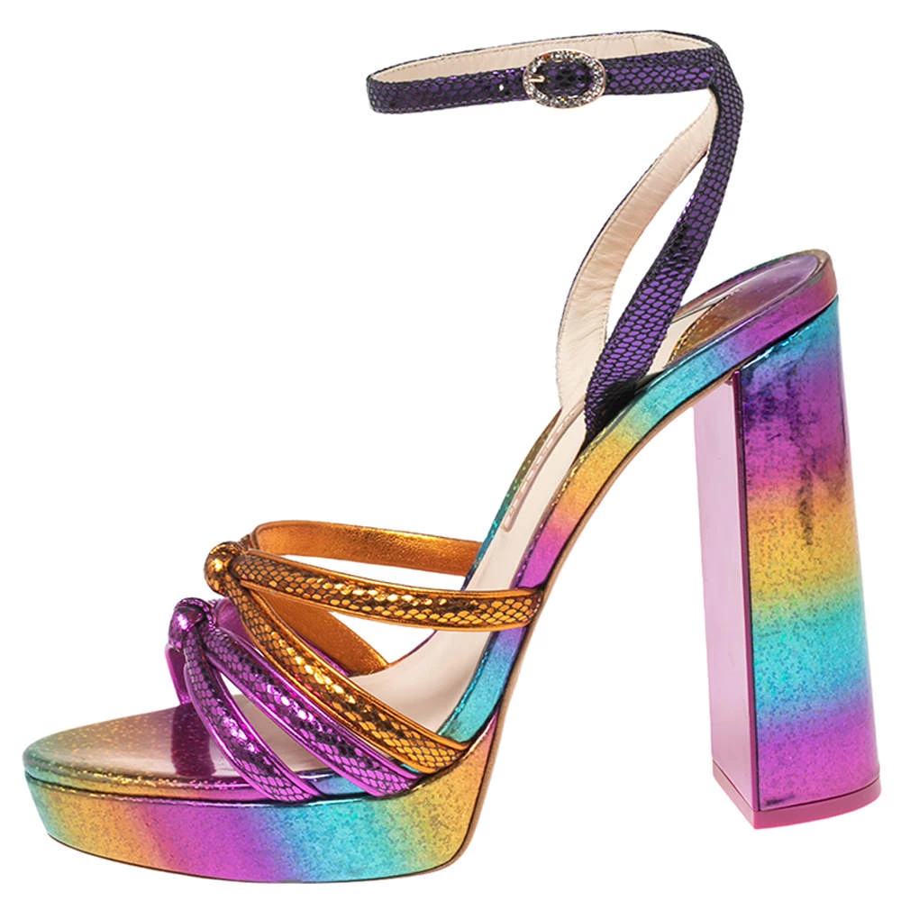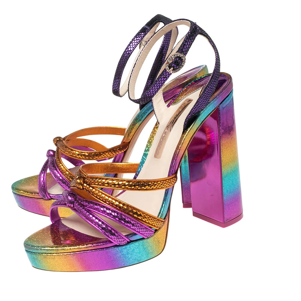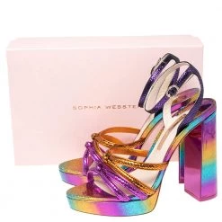 Beautifully made and designed into a chic silhouette, these Rainbow Freya sandals from Sophia Webster are a delightful sight! They are crafted using multicolored snakeskin-effect suede and feature open toes, platforms, and a buckled ankle strap. They have thick heels. Make a style statement by wearing them.