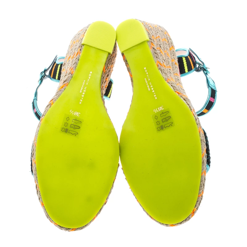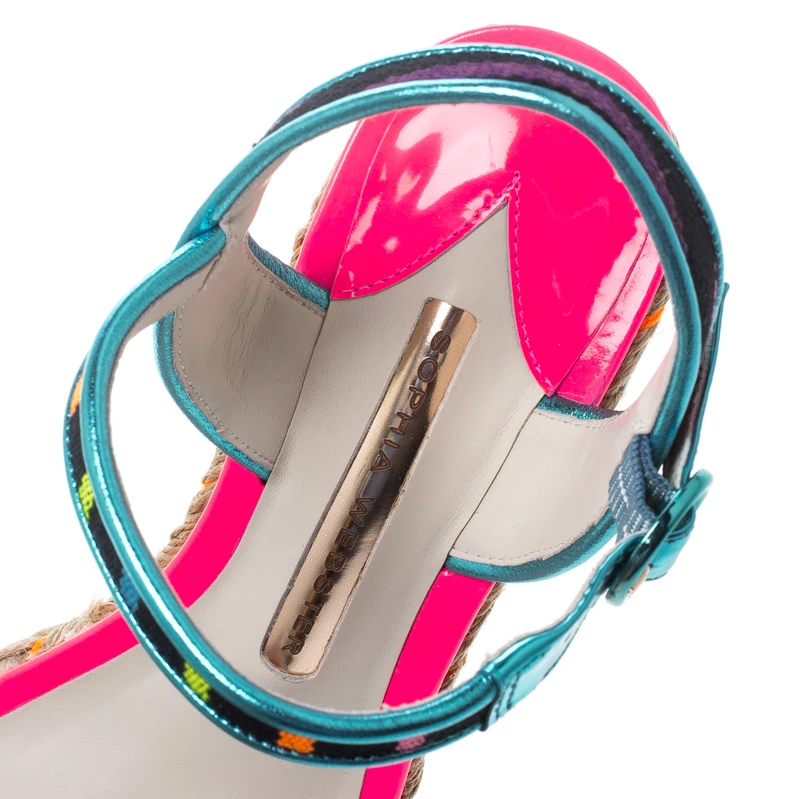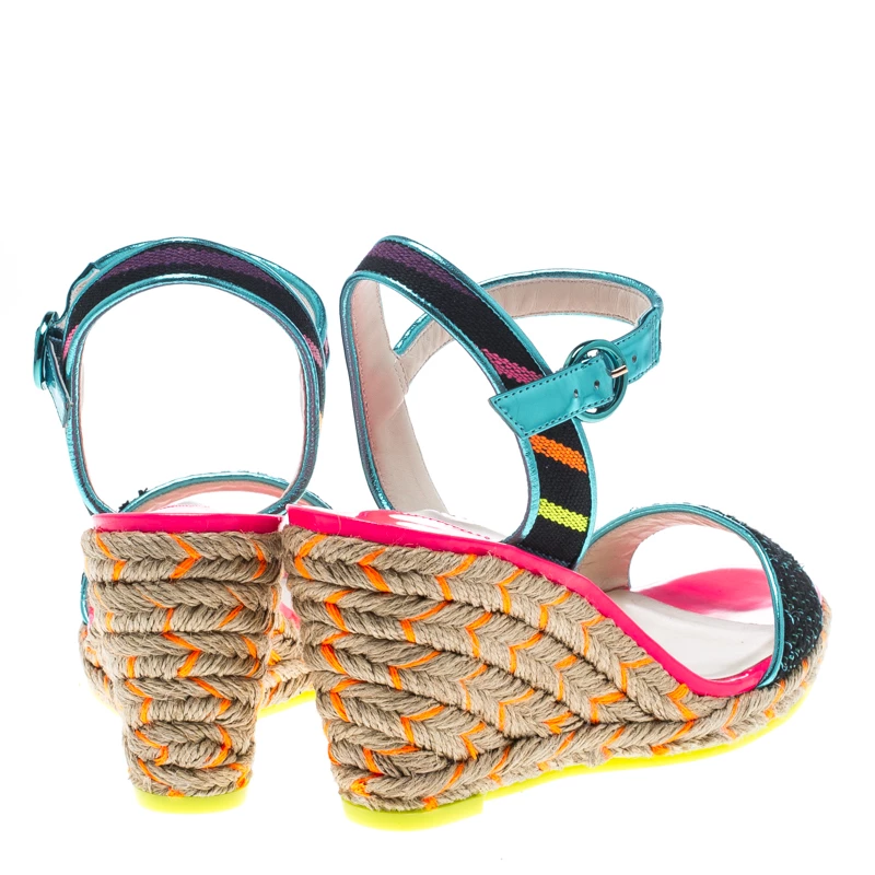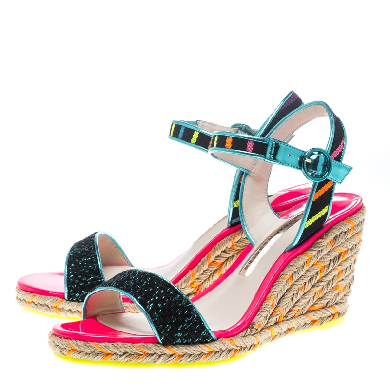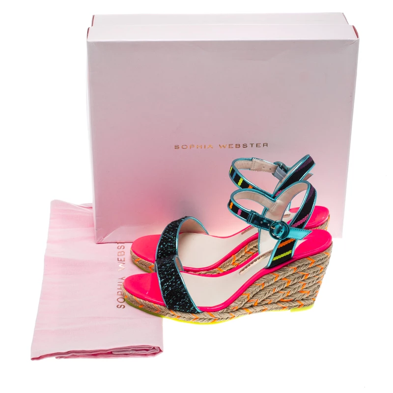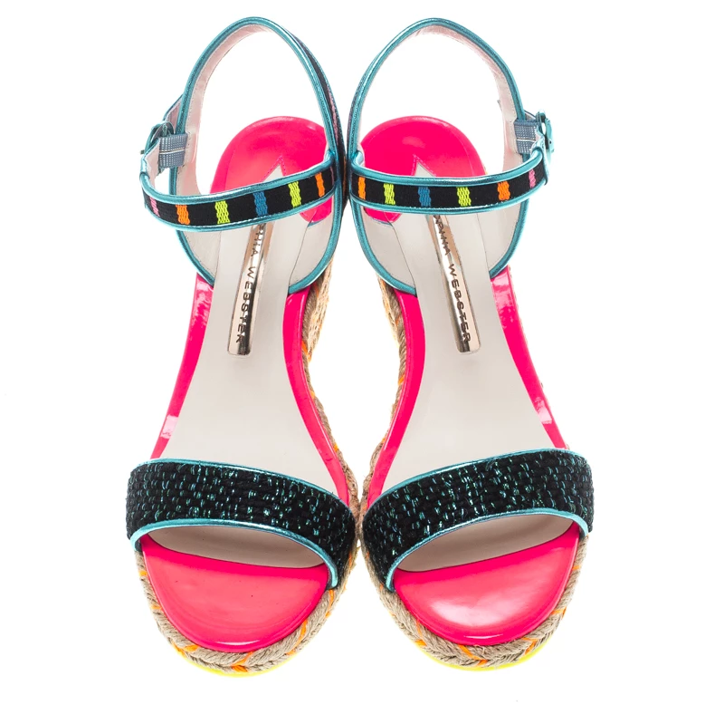 You’ll love walking in these vibrant Lucita sandals from Sophia Webster that are perfect for your fashionable outings. These multicolour sandals are crafted from canvas and leather and feature an open toe silhouette. They flaunt single vamp straps and buckled ankle straps. They come equipped with comfortable leather lined insoles and 8.5 cm espadrille wedge heels. Pair them with a knee-length dress and a sling bag to make heads turn.