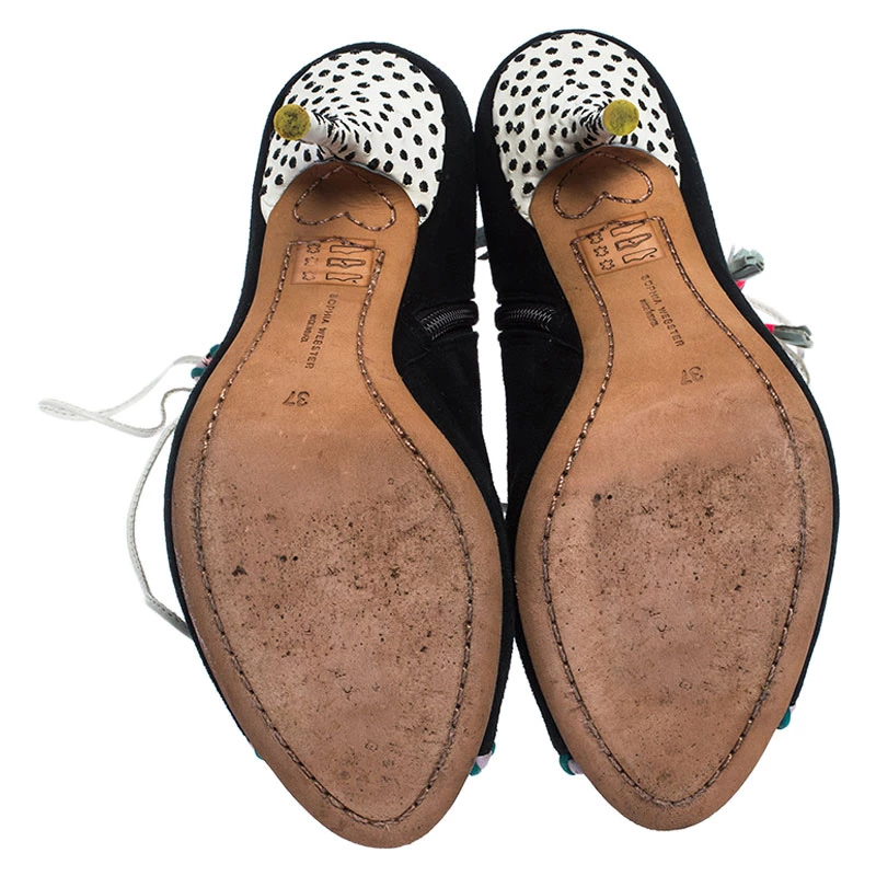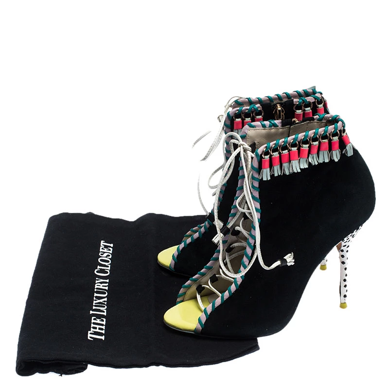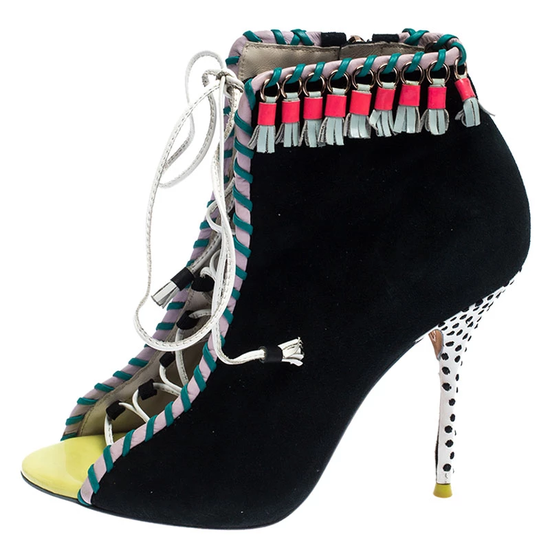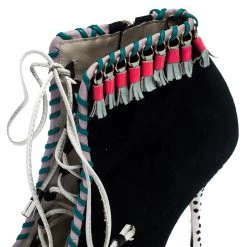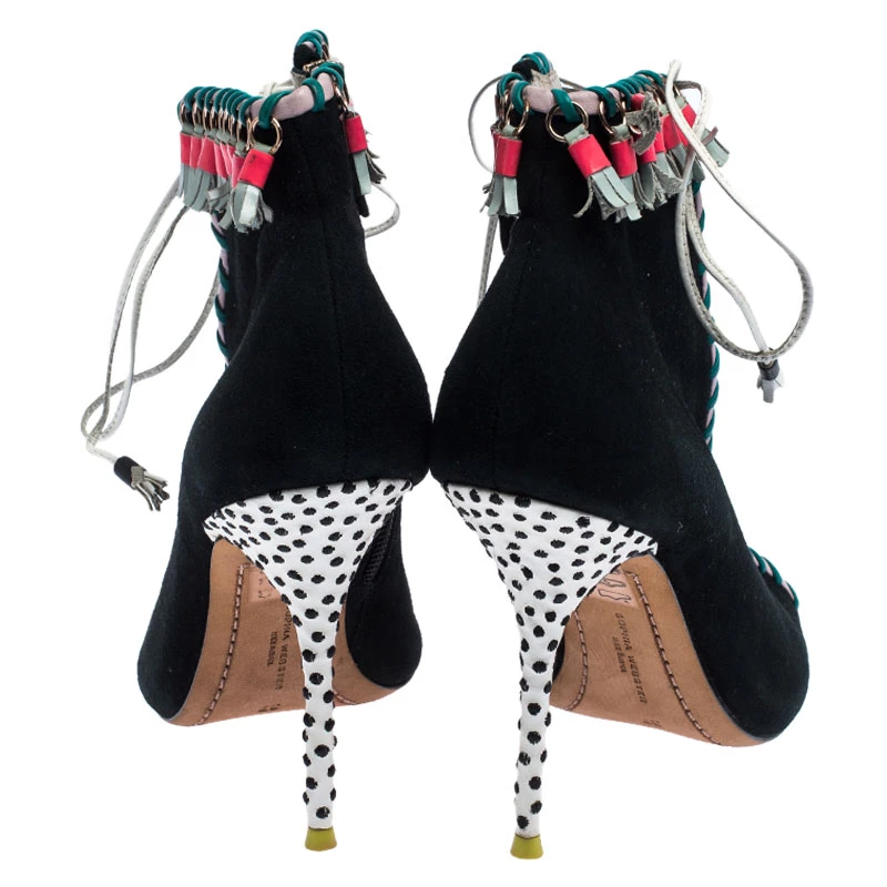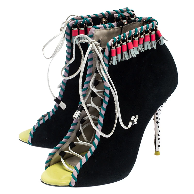 Contemporary and edgy, these ankle booties from Sophia Webster deserve a special place in your wardrobe! The booties have been crafted from suede and feature an open toe silhouette. They have been styled with lace-up on the vamps and embellished with tassels. Comfortable leather lined insoles and 11 cm stiletto heels complete this gorgeous pair.