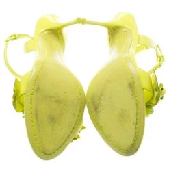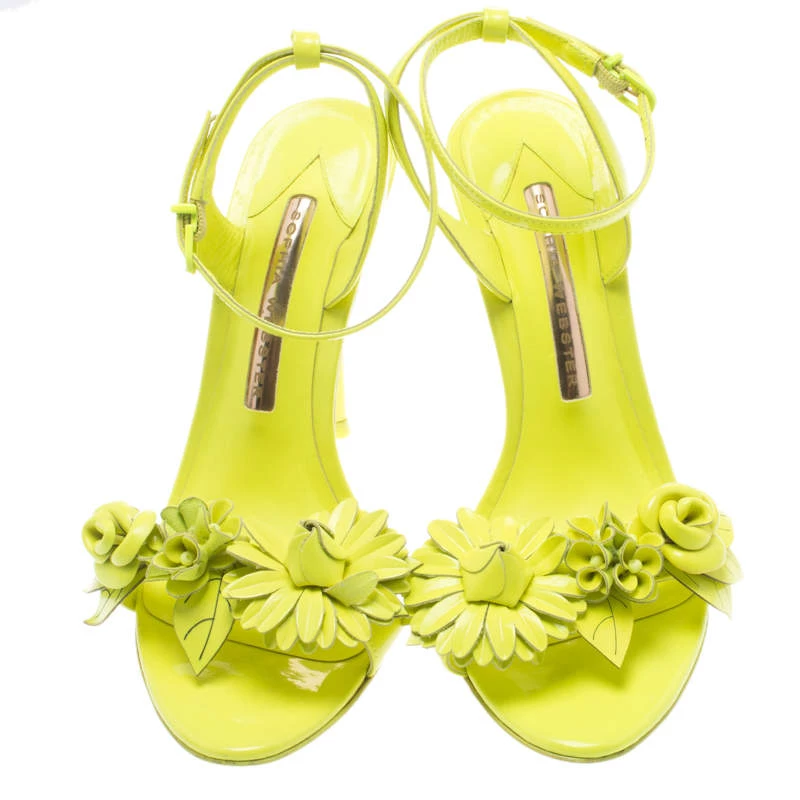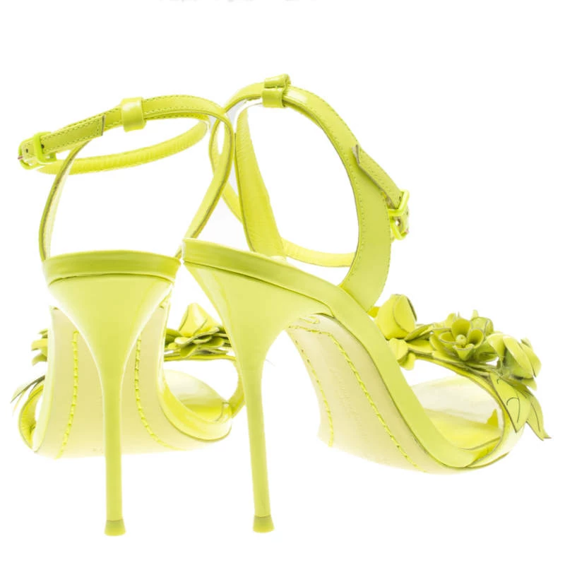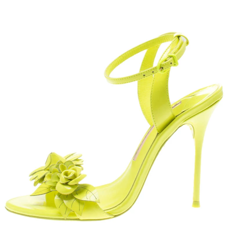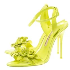 Sophia Webster has been a favourite worldwide for her unique, creative and modern designs. She continues to charm us with these stunning Lilico sandals. These neon green sandals are crafted from patent leather and feature an open toe silhouette. They flaunt lovely flowers embellished on the vamp straps and come equipped with buckled ankle wraps. Comfortable leather lined insoles and 10.5 cm stiletto heels complete this gorgeous pair.