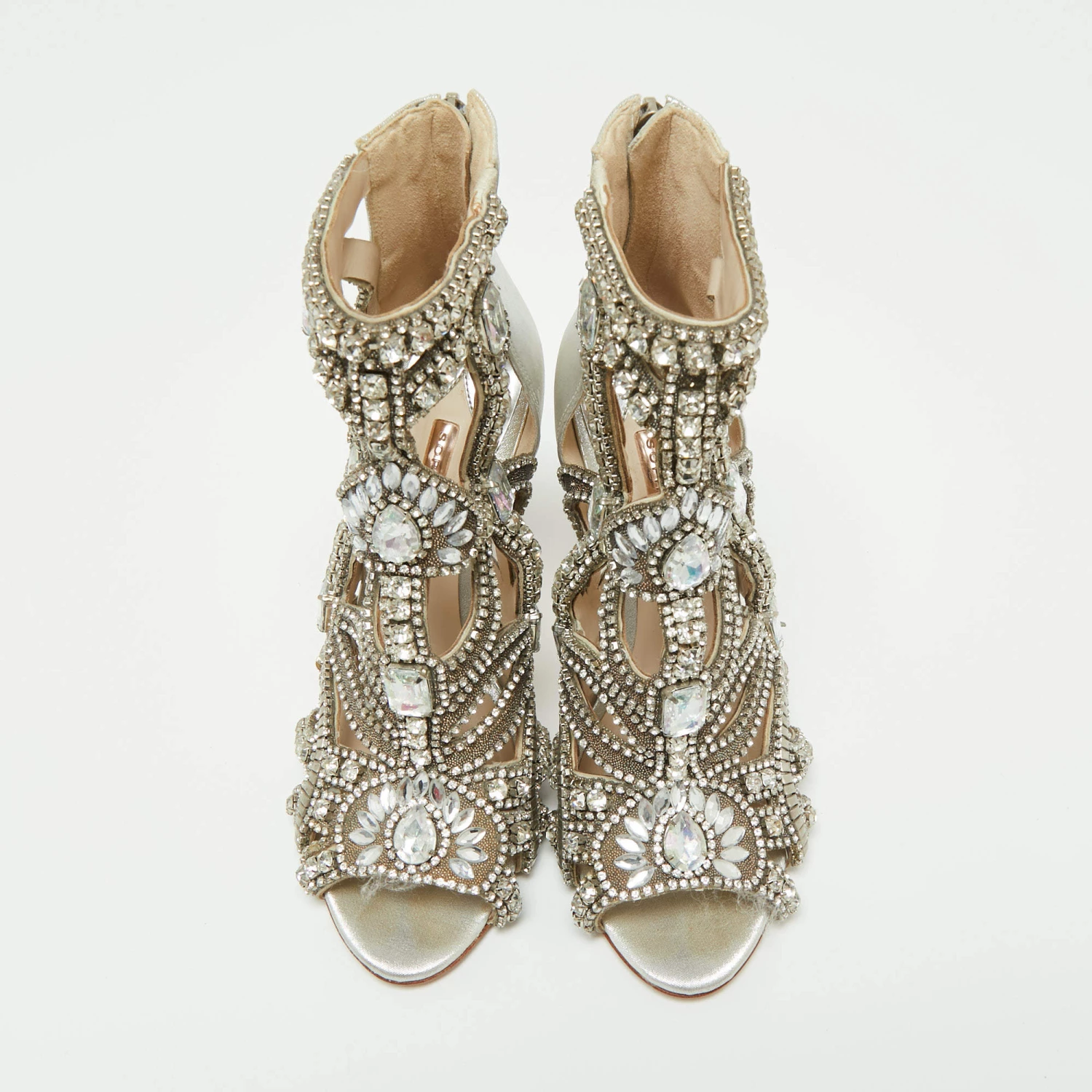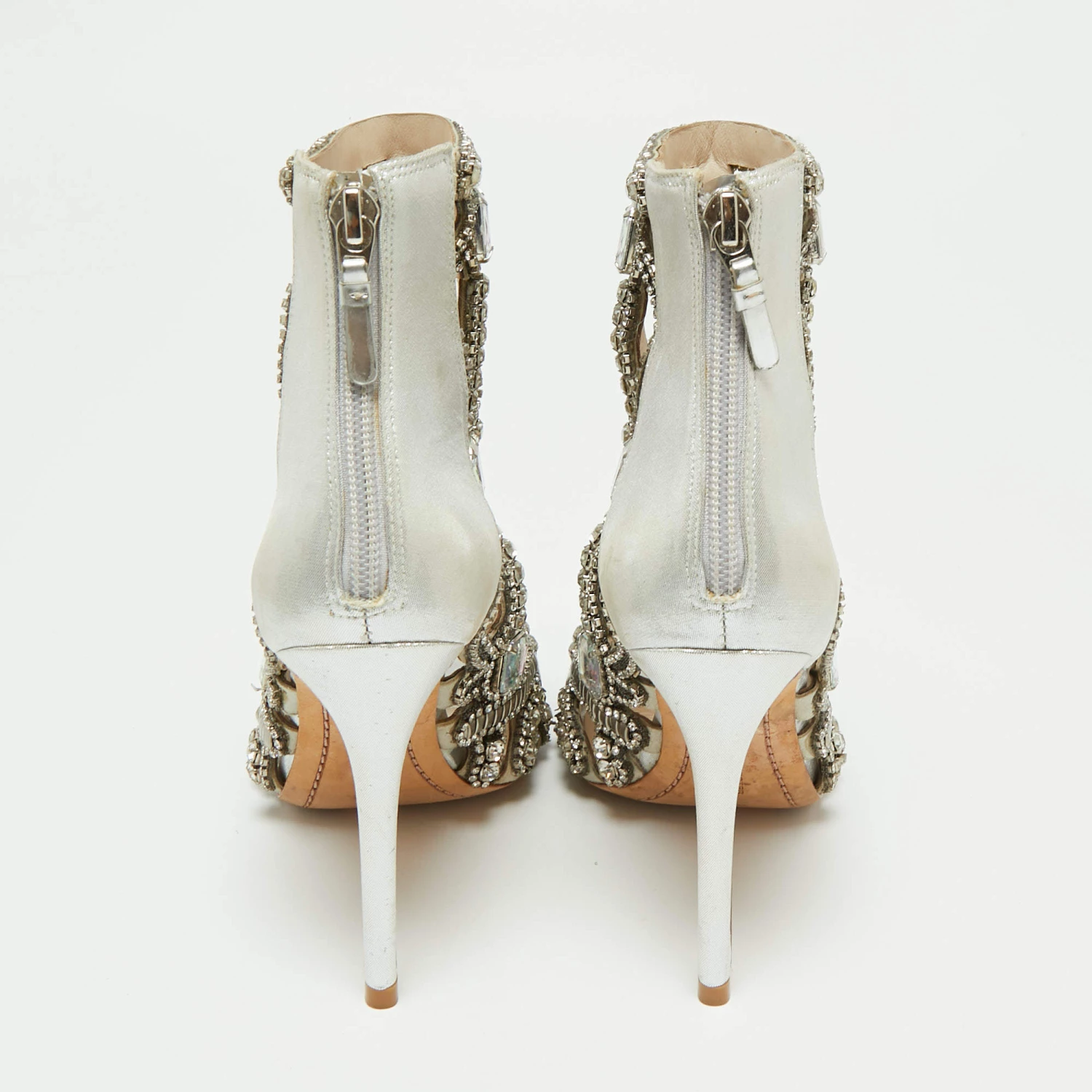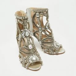 These ultra-glamorous booties by Sophia Webster are utterly mesmerizing and filled with so much beauty, they make our hearts flutter. They carry a silver fabric and leather exterior, shimmering crystal embellishments on the caged silhouette, and slender heels that will surely make heads turn. They’ll look fabulous with black dresses!