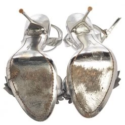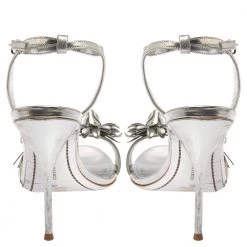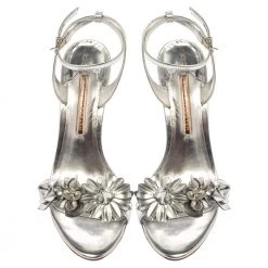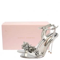 Sophia Webster has been a favorite worldwide for her unique, creative, and modern designs. She continues to charm us with these stunning Lilico sandals. They are crafted from silver foil leather and feature an open toe silhouette. They flaunt lovely floral embellishments on the vamp straps and come equipped with buckled ankle wraps. Comfortable leather lined insoles and 11 cm stiletto heels complete this gorgeous pair.
